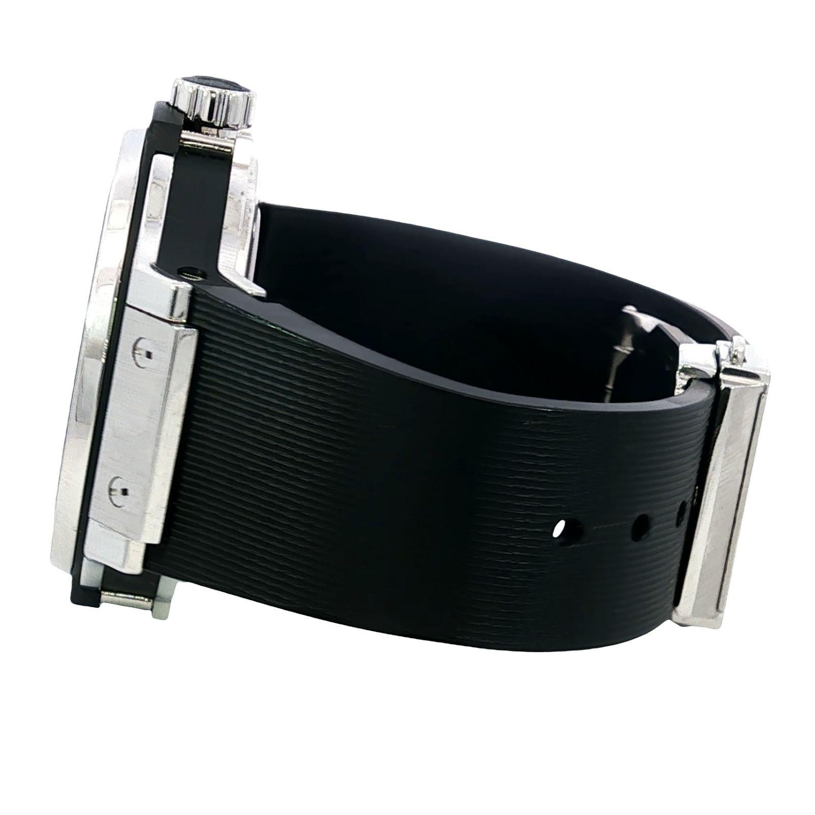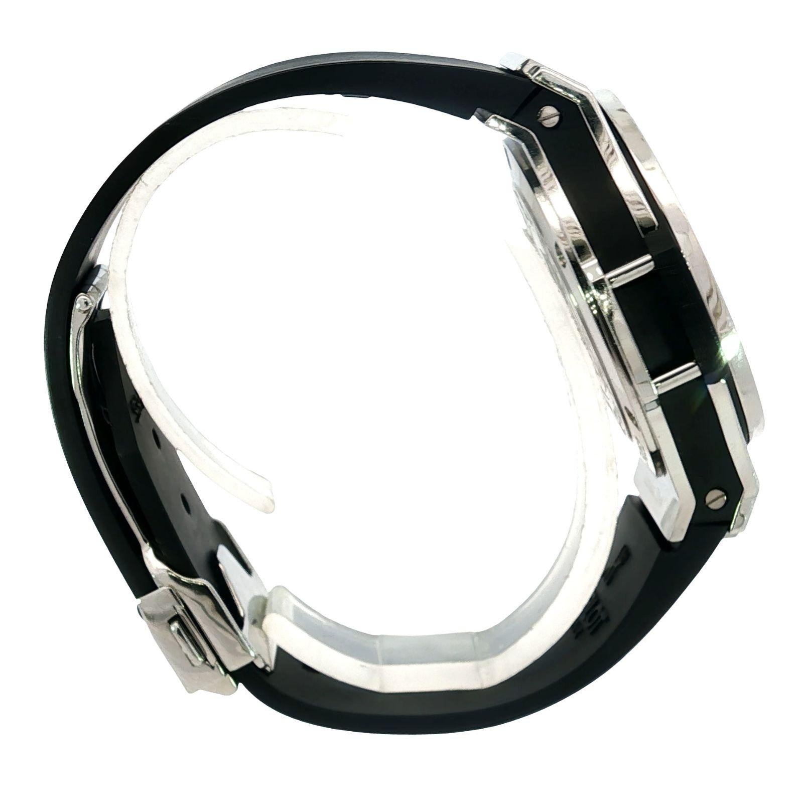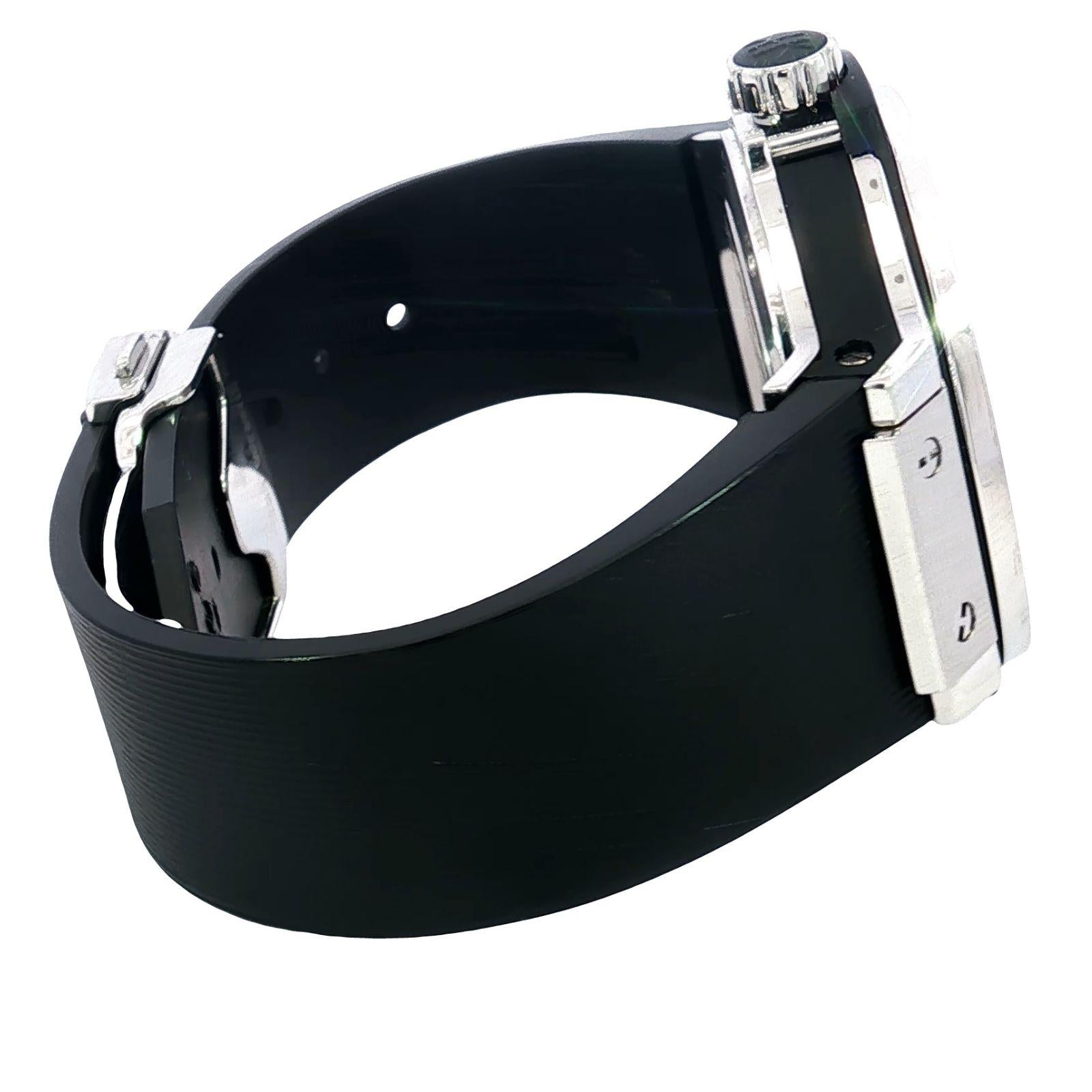 The 38mm case is crafted from stainless steel and titanium for strength and durability, while the black rubber strap brings comfort and a contemporary edge. Together, the mix of materials reflects Hublot’s distinctive approach to watchmaking — robust, innovative, and stylish.