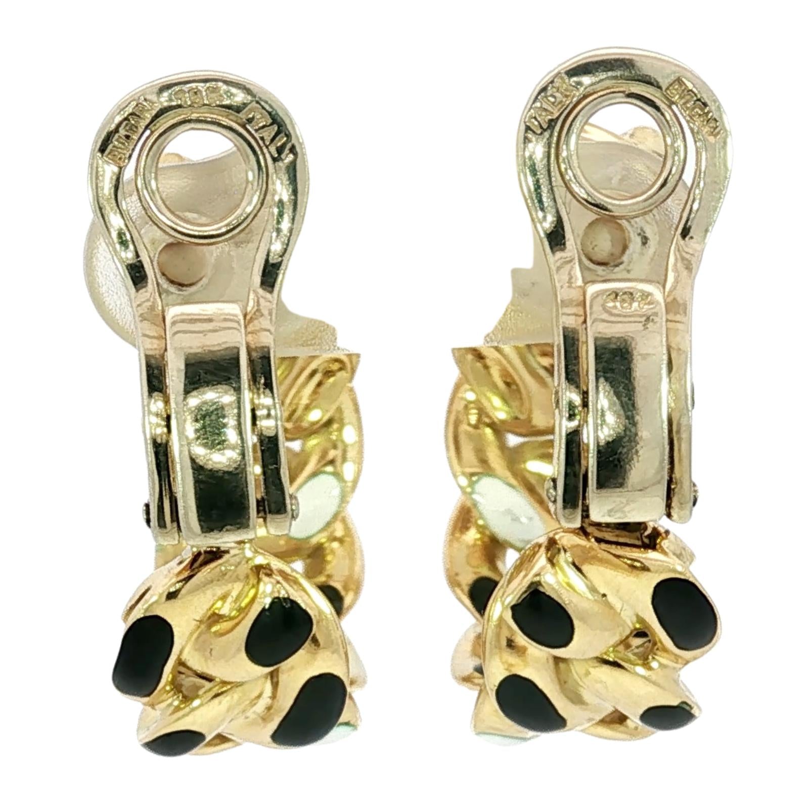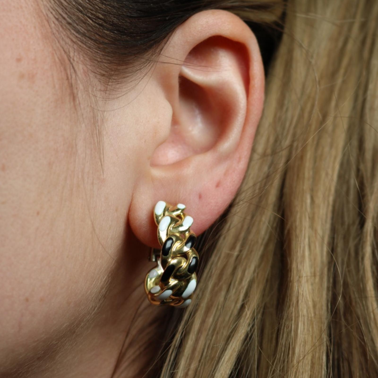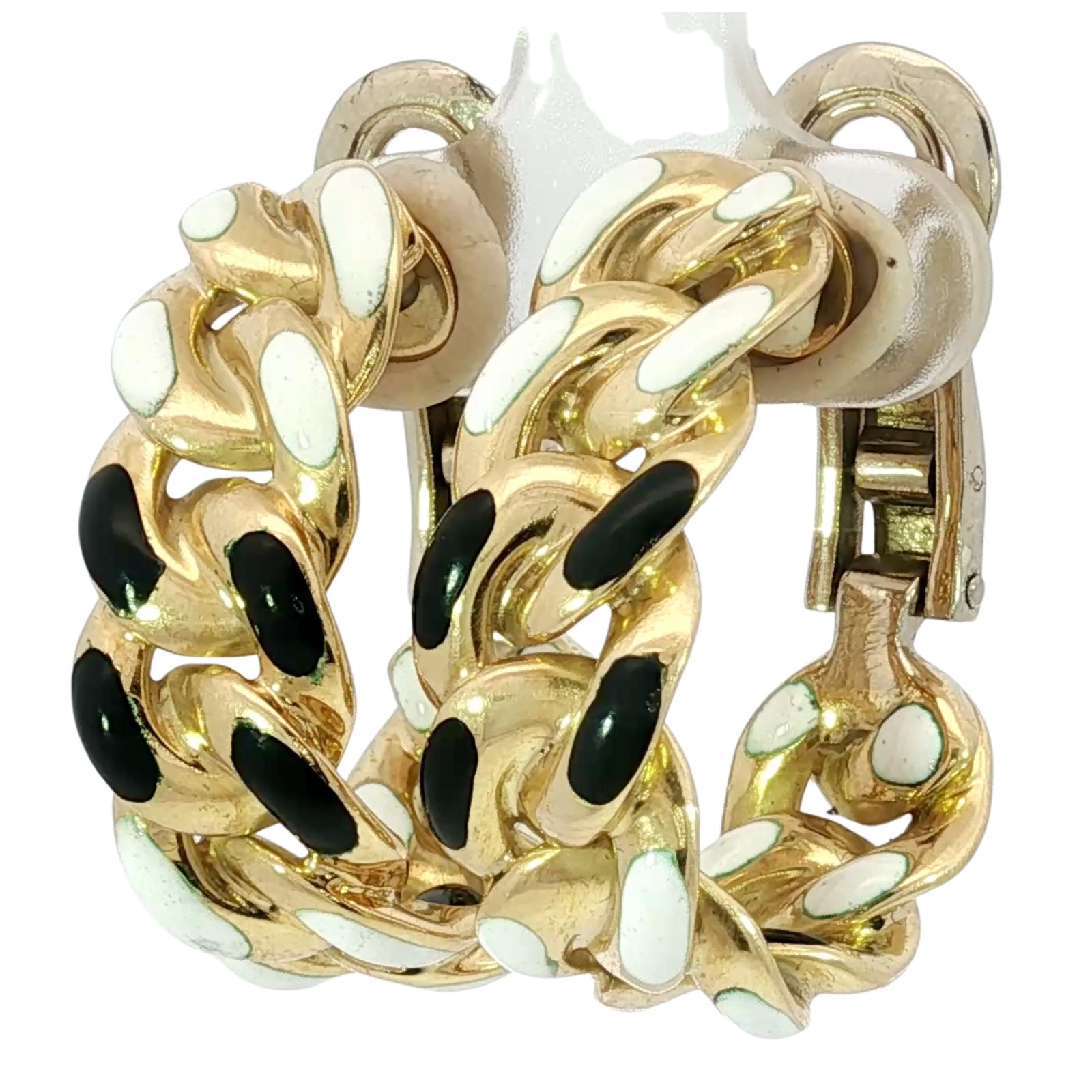Bulgari Enamel Cuban Link Earrings Clip Ons Black White Enamel 18K Yellow Gold