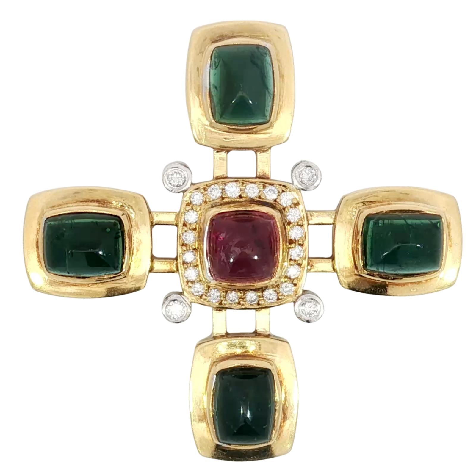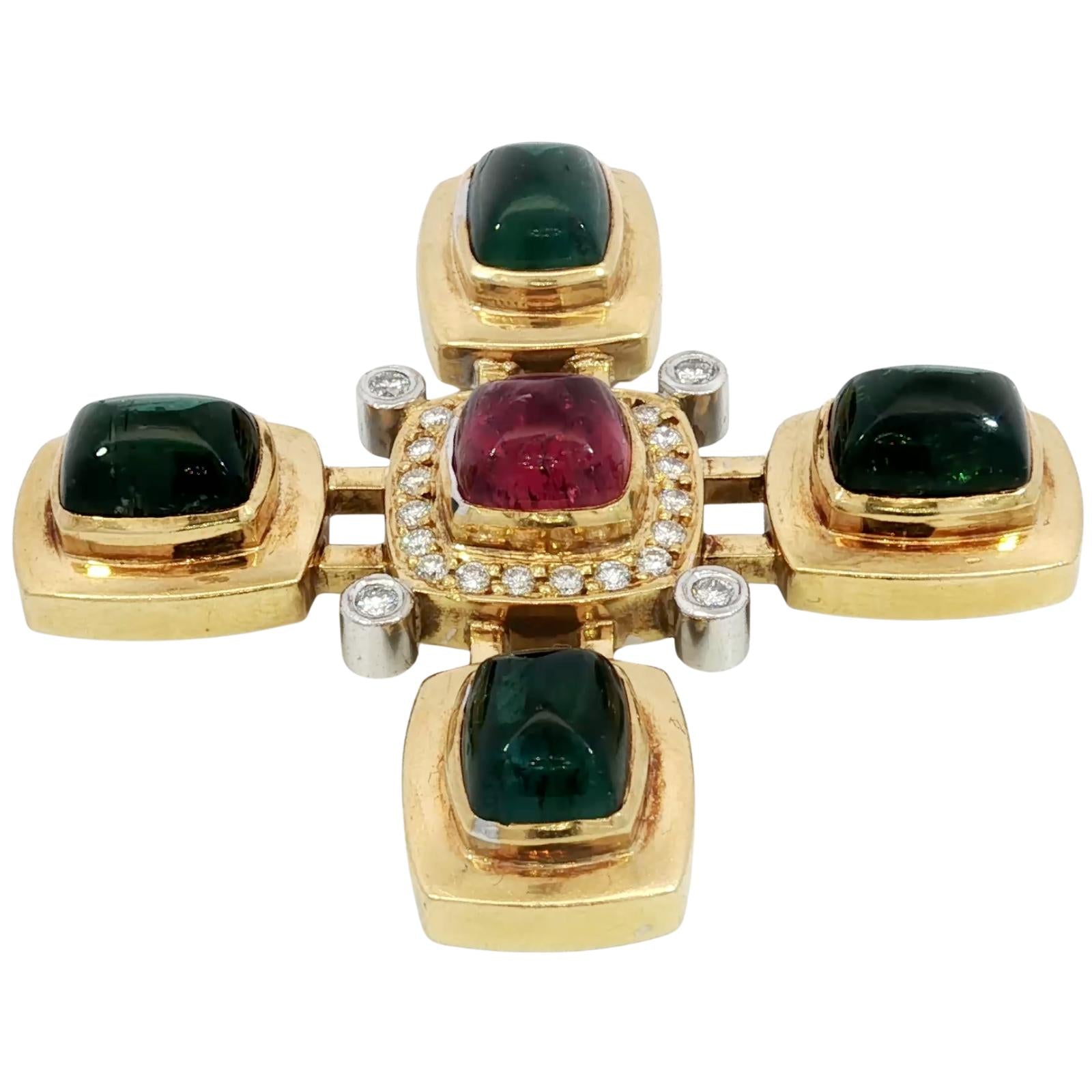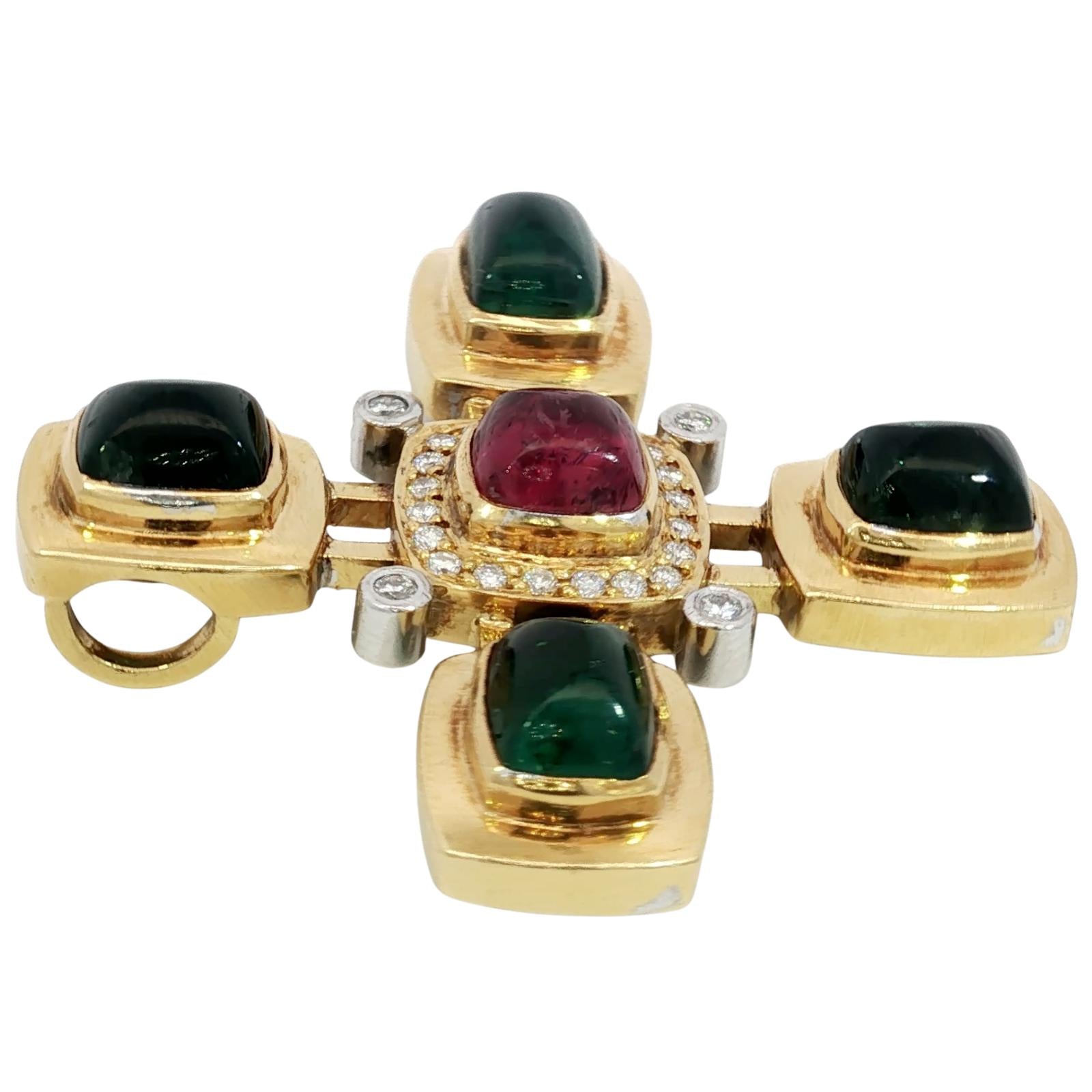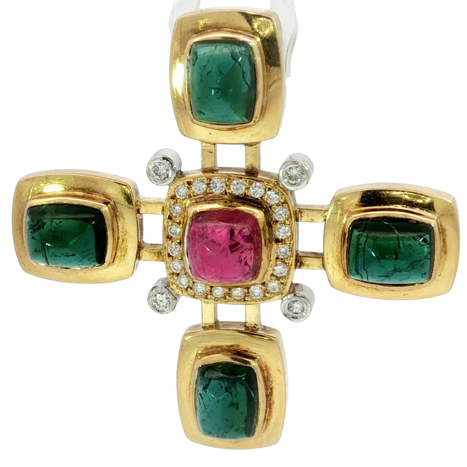 Estate 18K Tourmaline Cross Pendant Diamond Accents Yellow Gold ~16.8ctw
