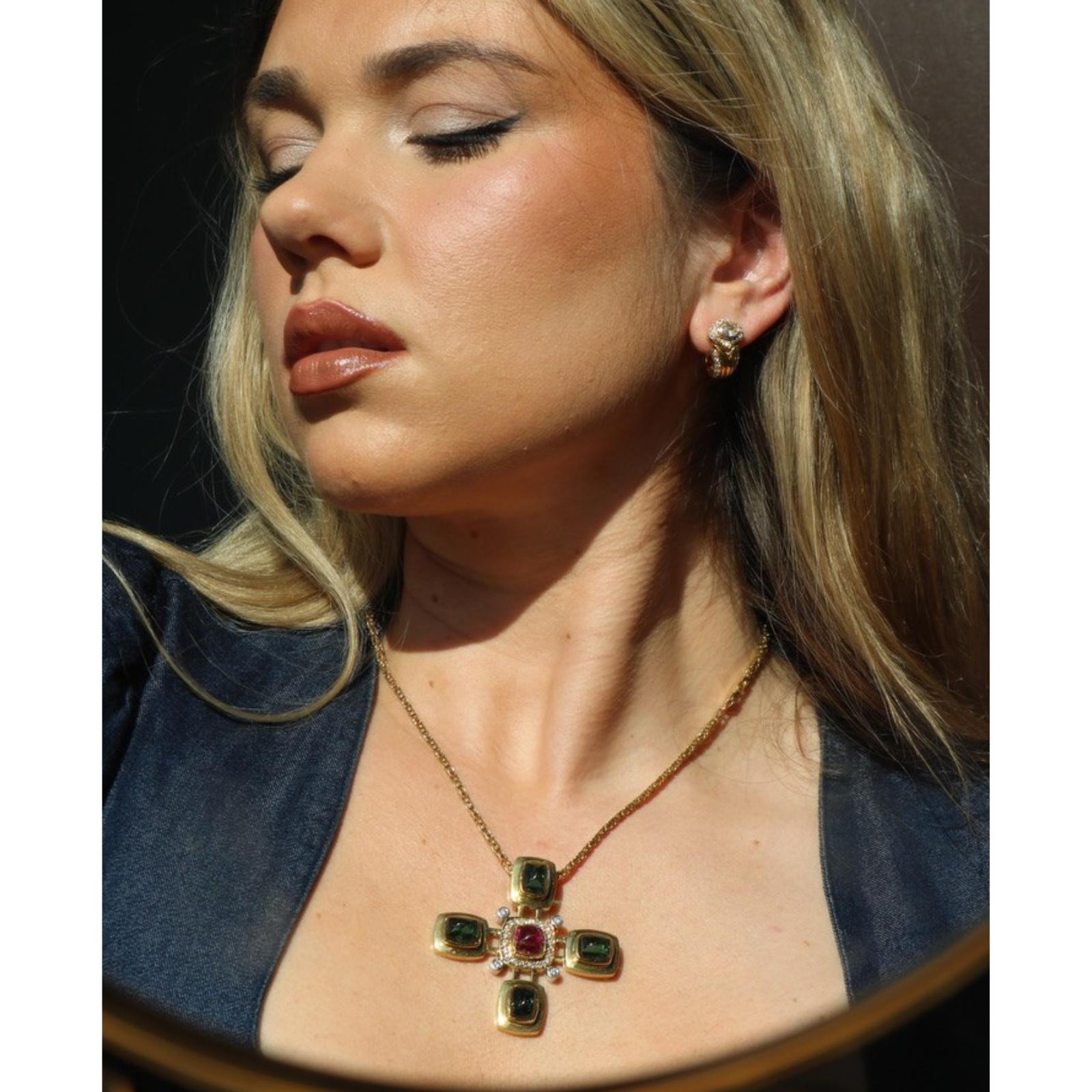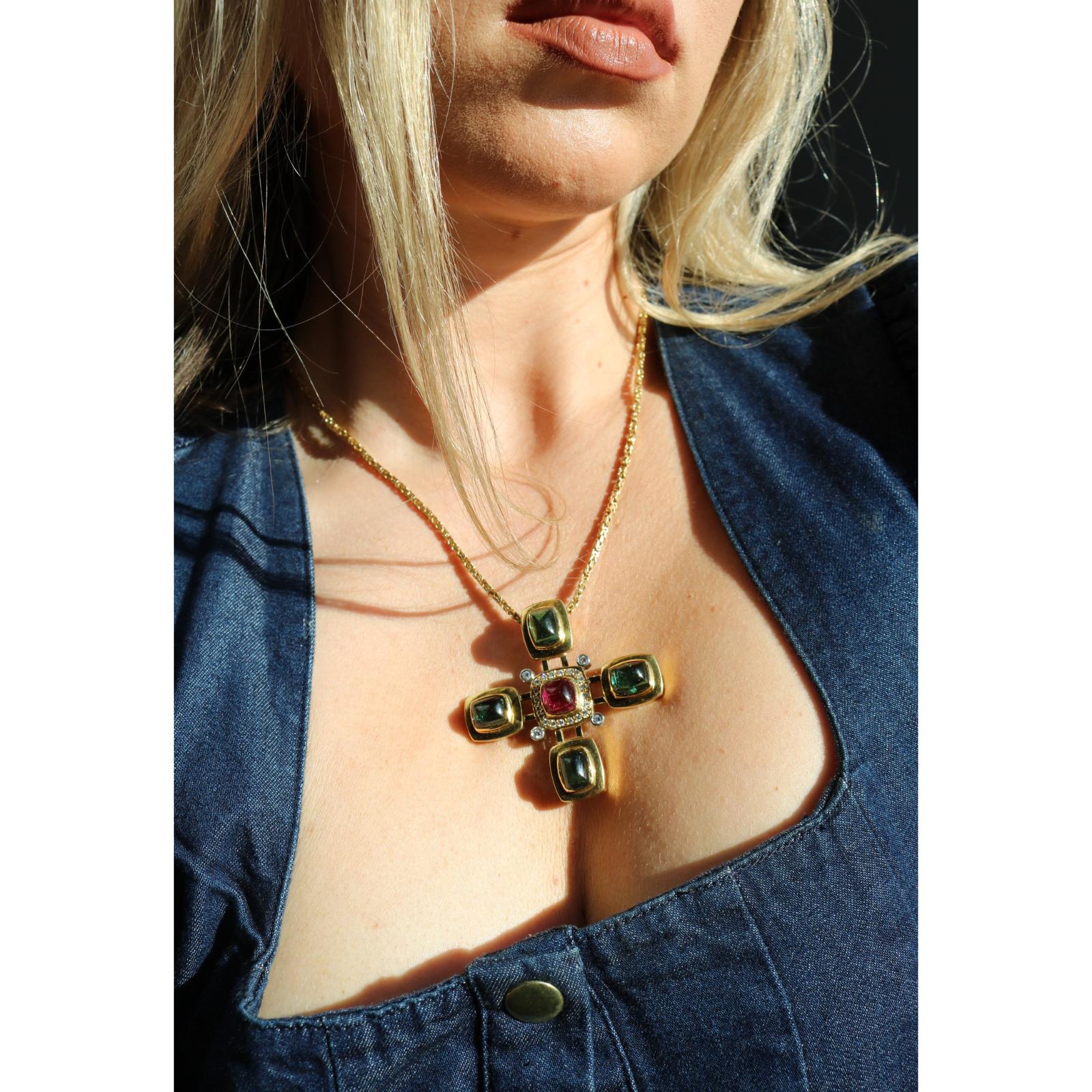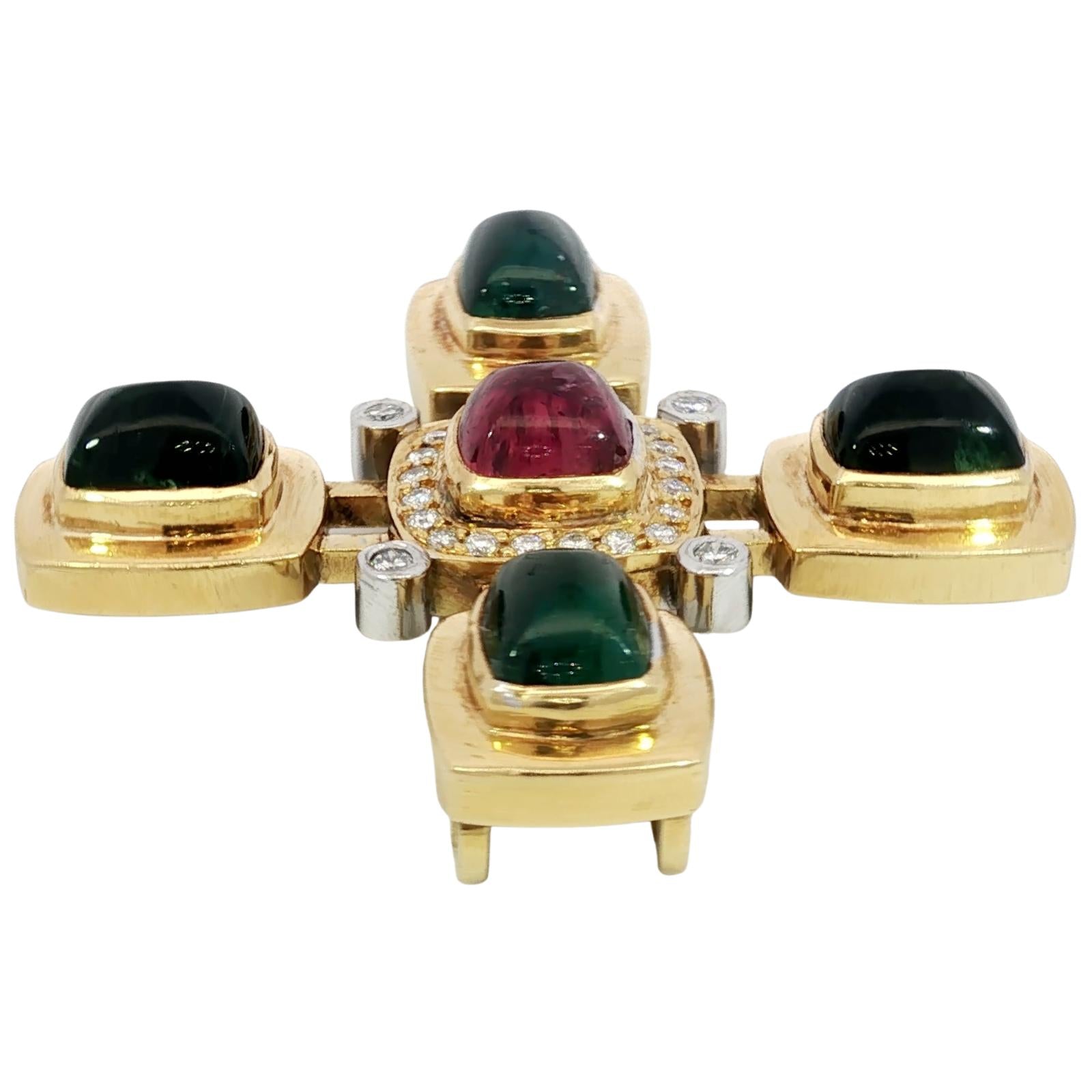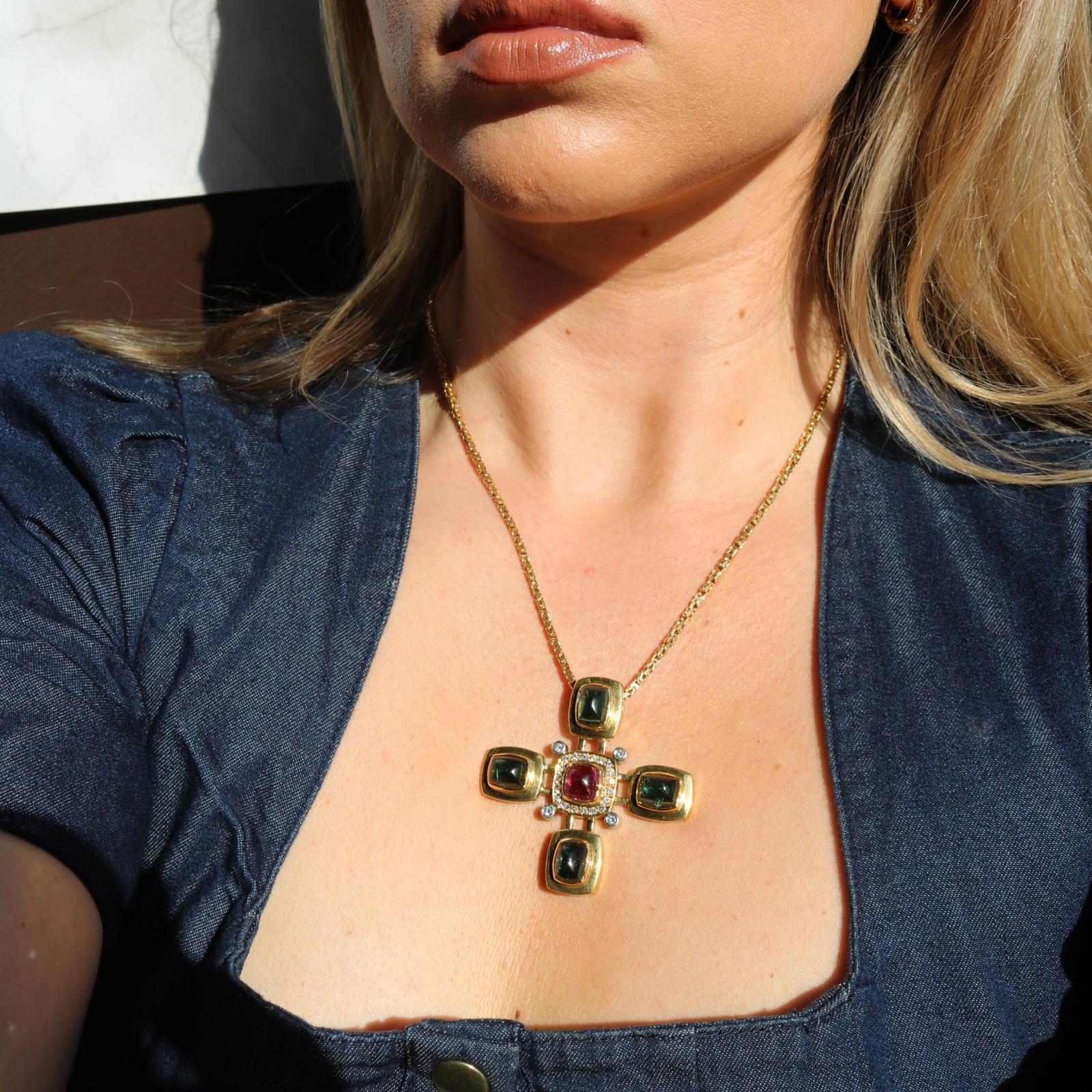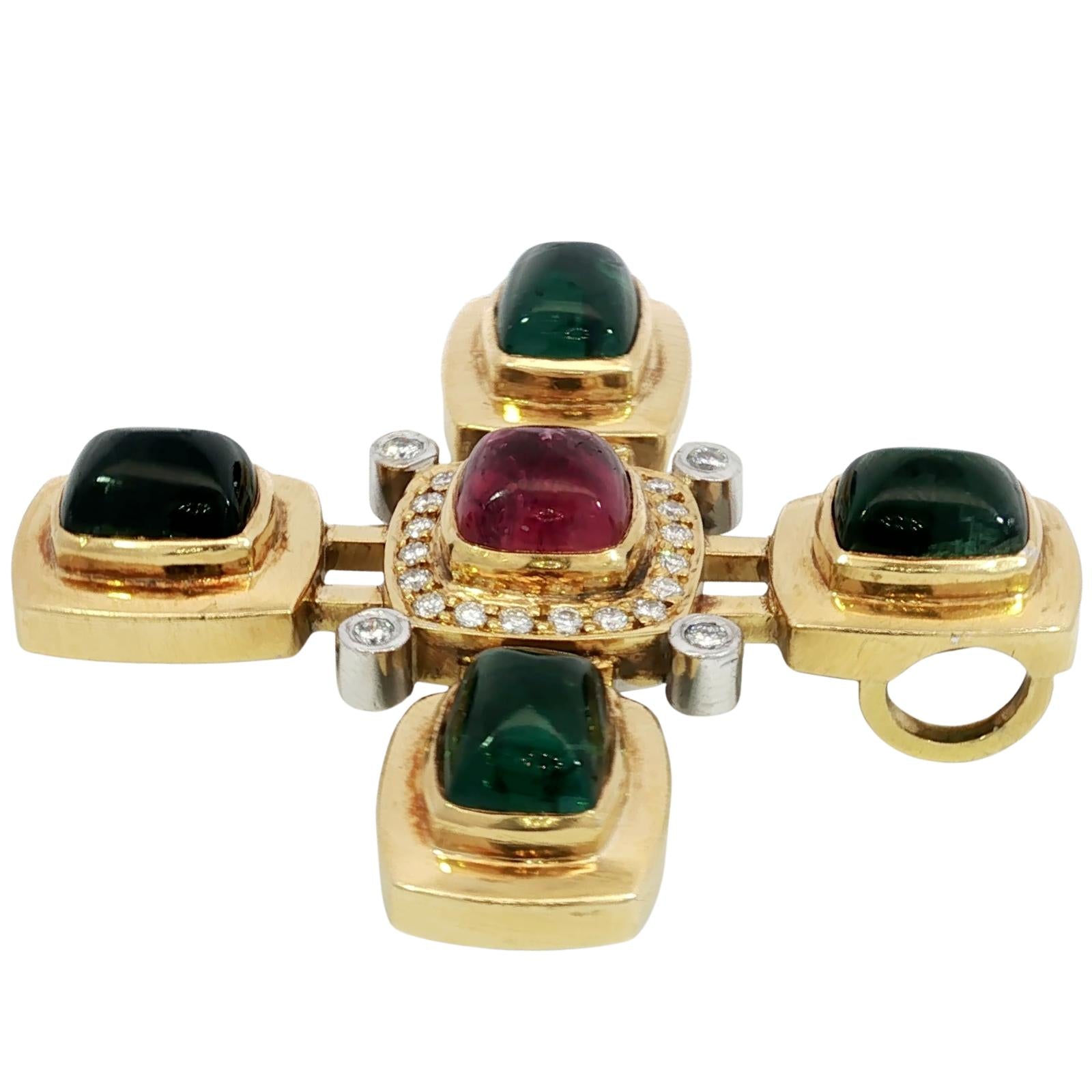 Estate 18K Tourmaline Cross Pendant Diamond Accents Yellow Gold ~16.8ctw
