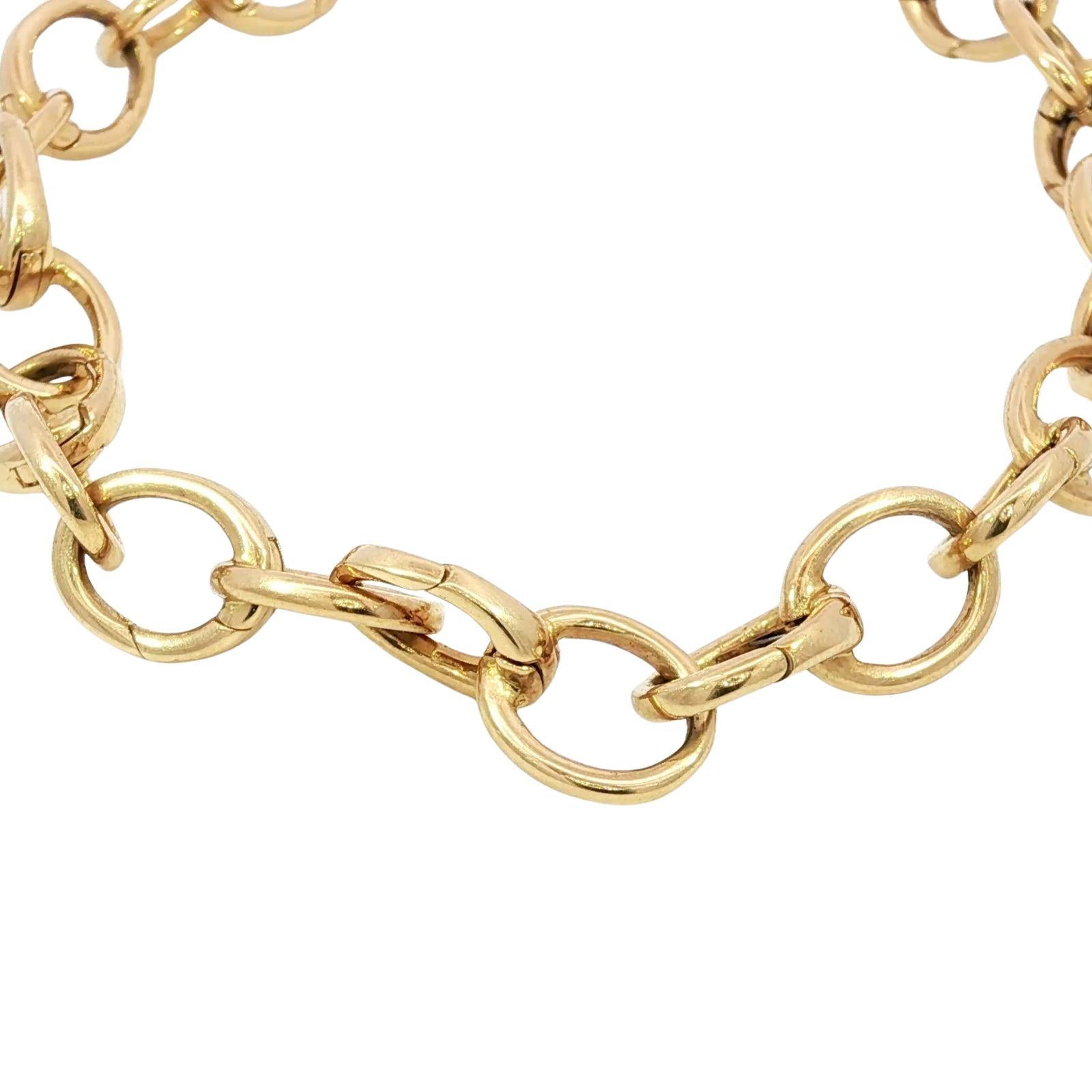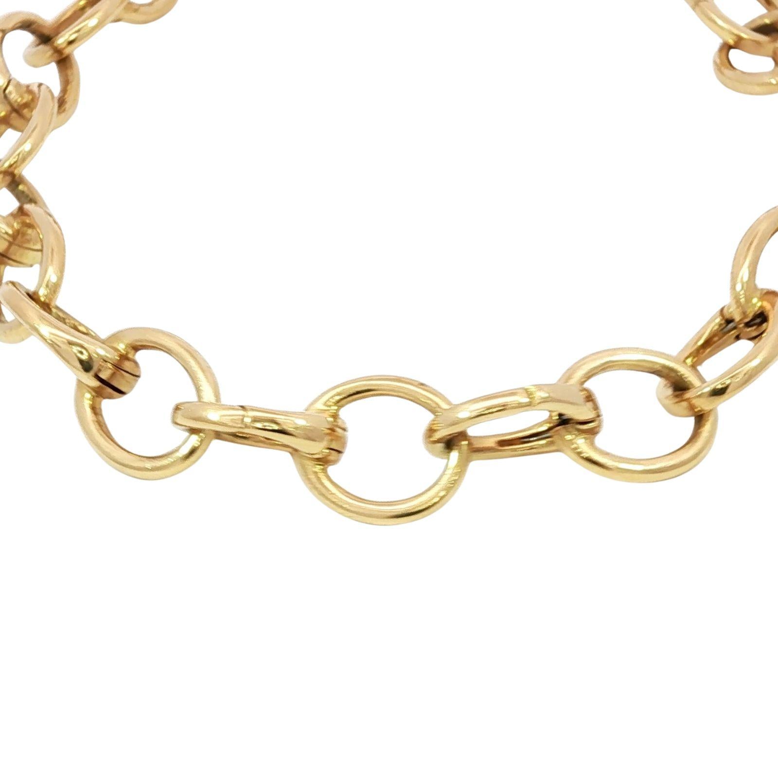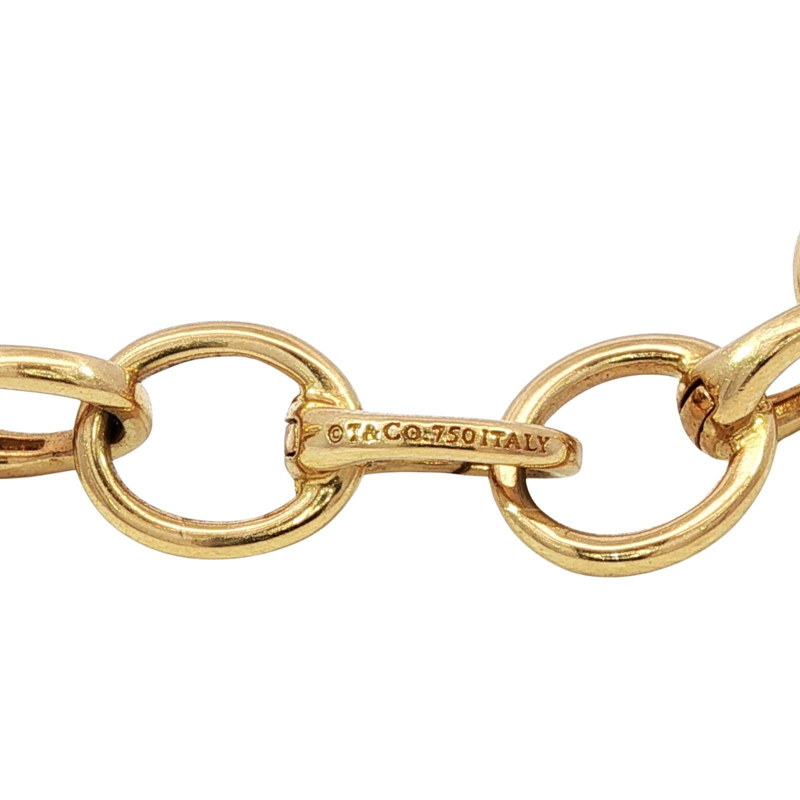 This Tiffany & Co. bracelet is made in 18k yellow gold, designed with a series of interlocking circular links that flow seamlessly around the wrist. Of the links, 13 are engineered to open individually, allowing you to attach charms in any order or combination you like—giving the piece a versatile and highly personal character.