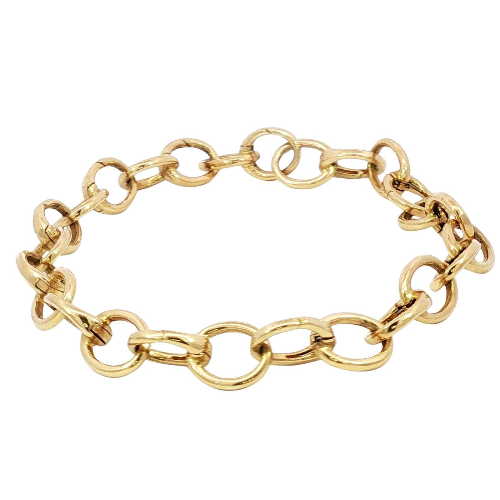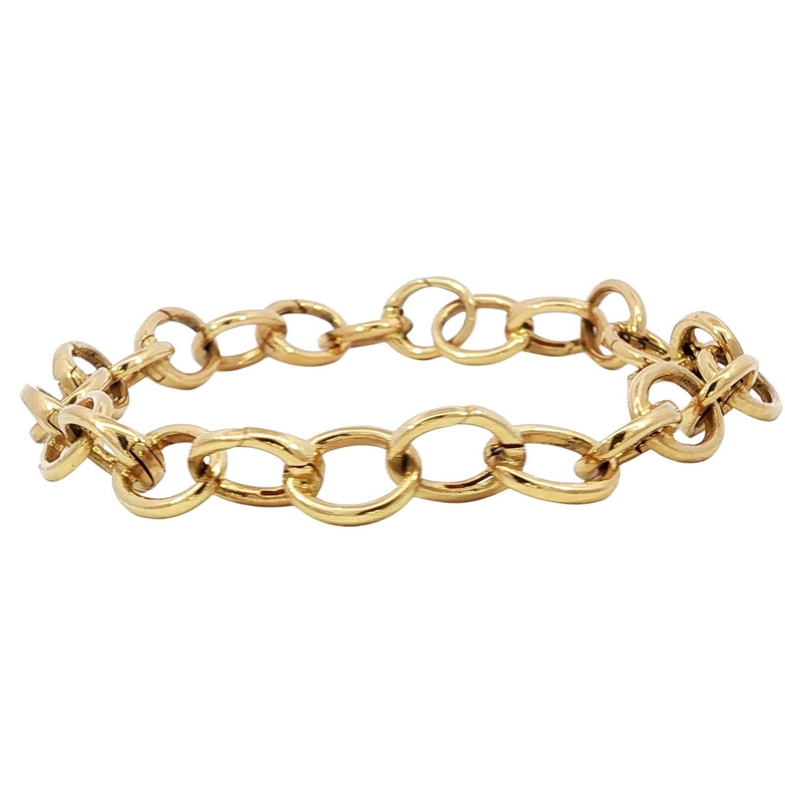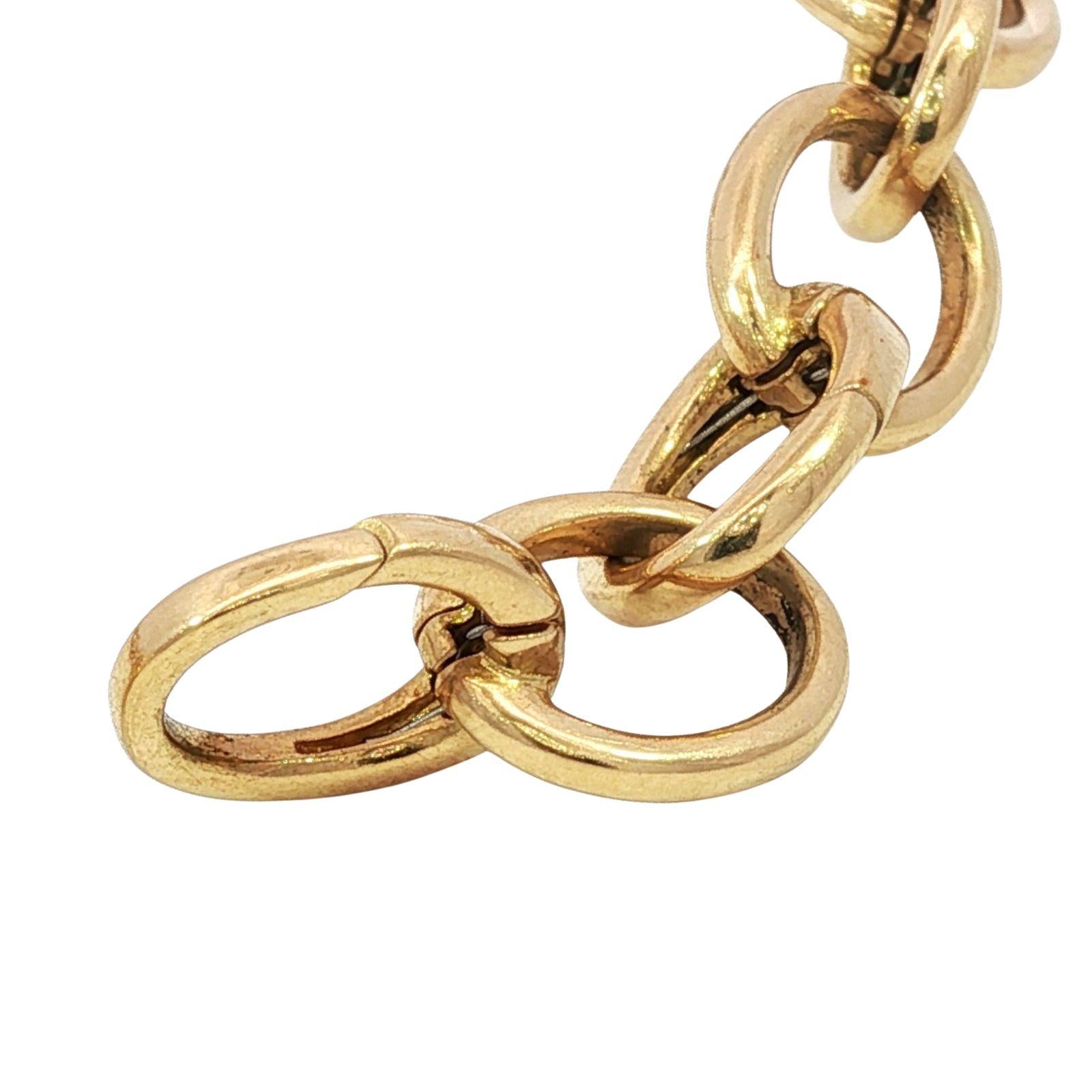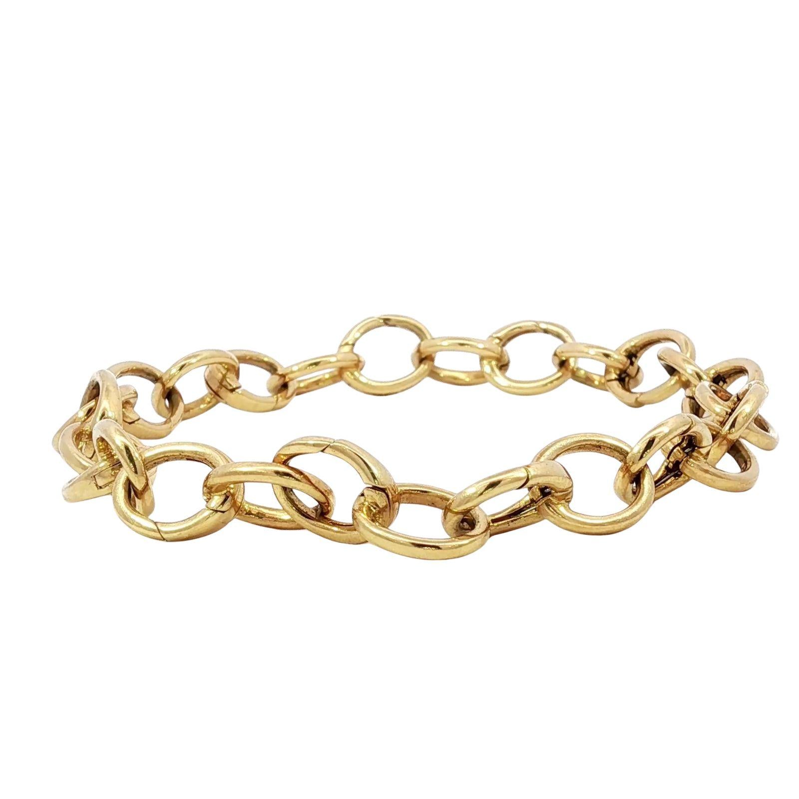 This Tiffany & Co. bracelet is made in 18k yellow gold, designed with a series of interlocking circular links that flow seamlessly around the wrist. Of the links, 13 are engineered to open individually, allowing you to attach charms in any order or combination you like—giving the piece a versatile and highly personal character.