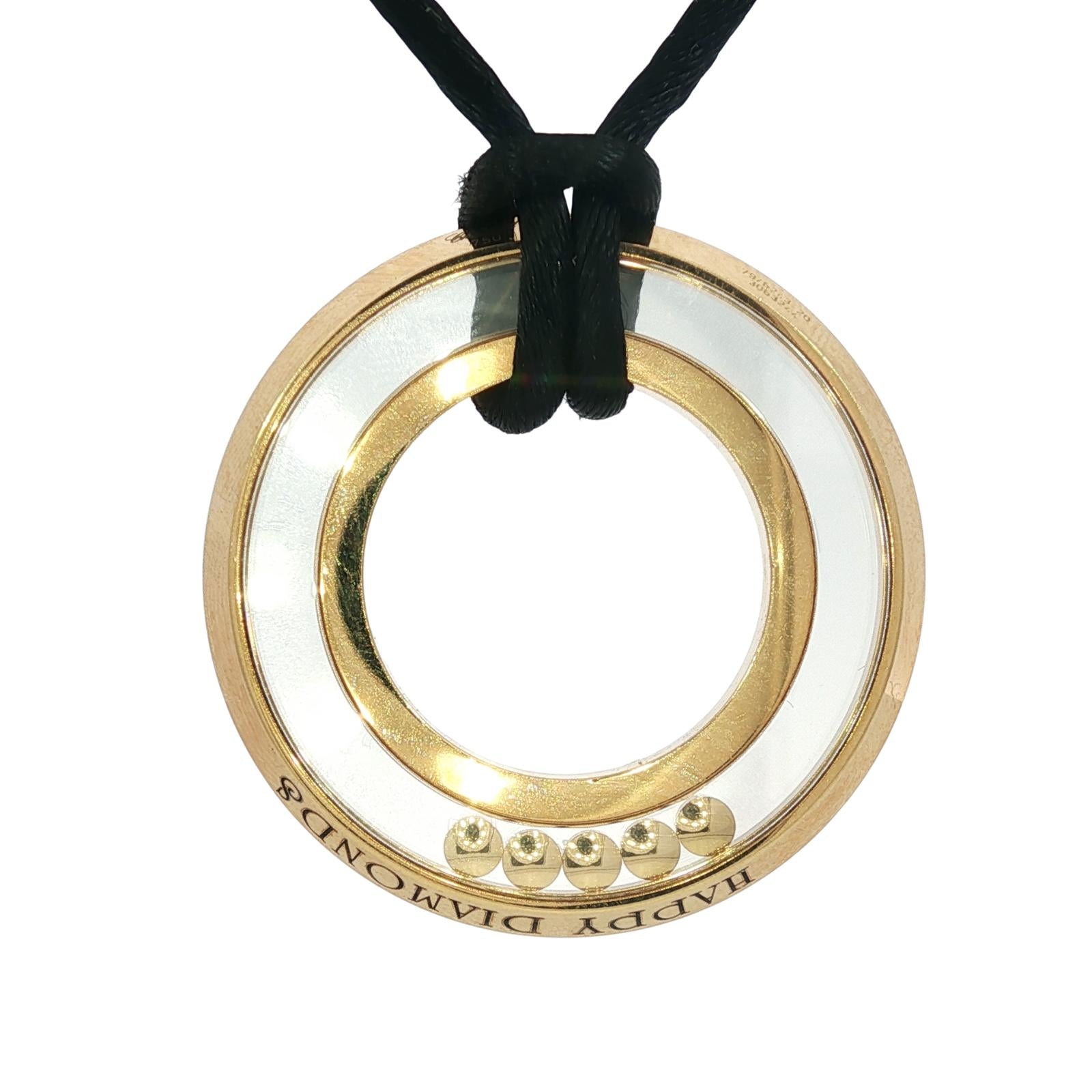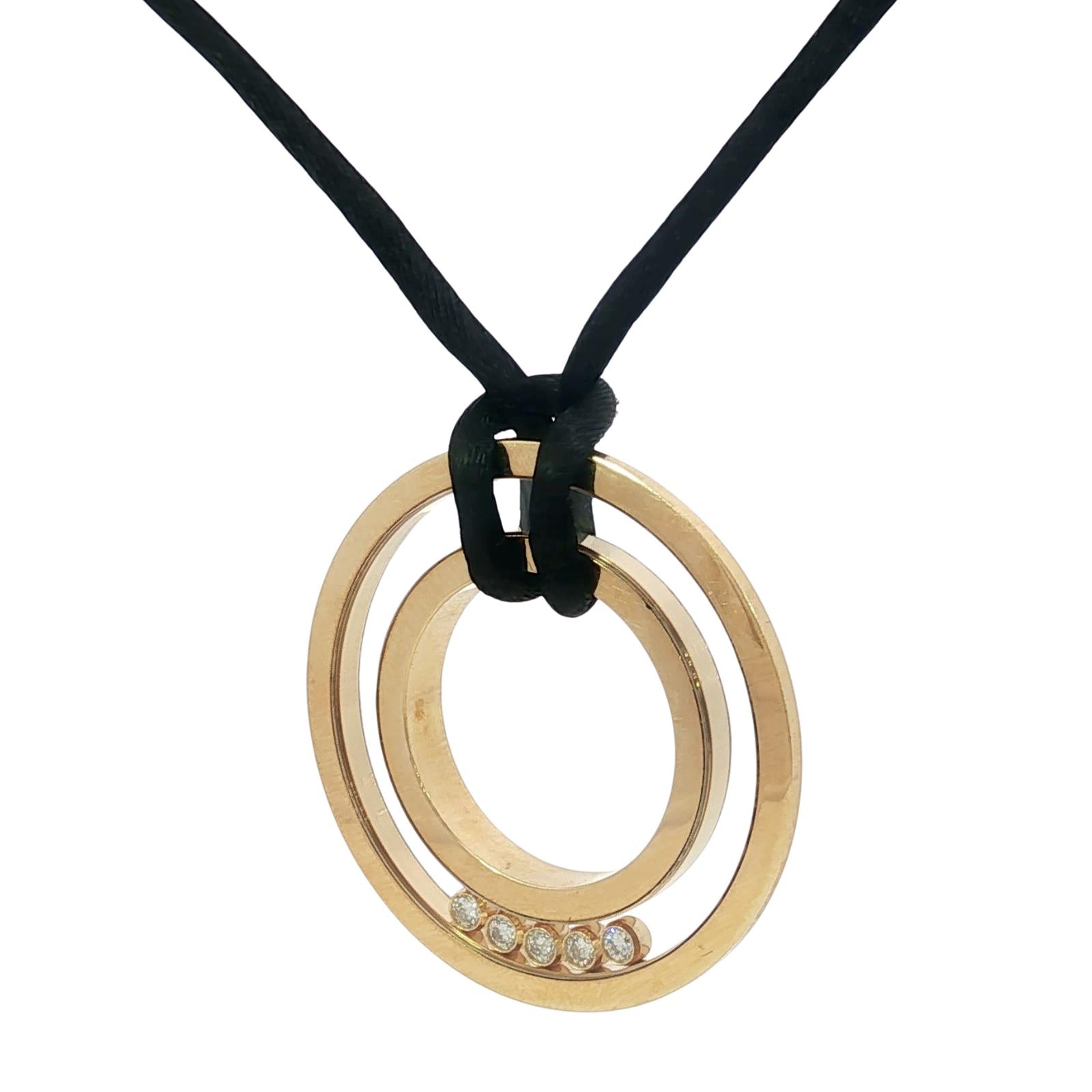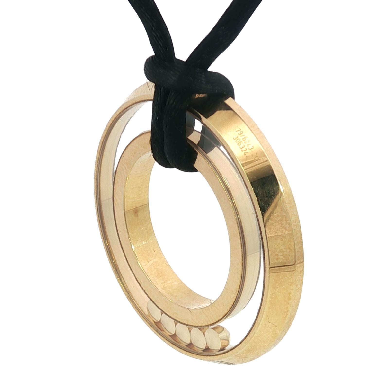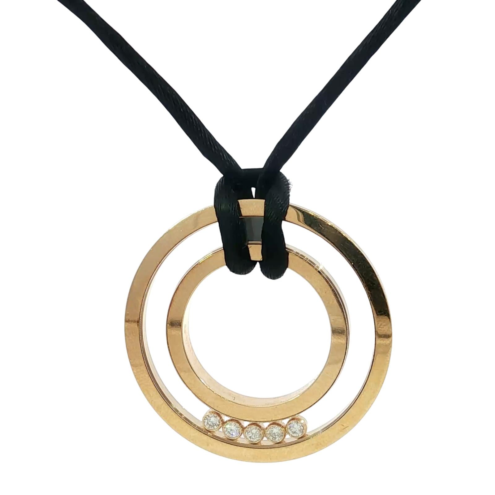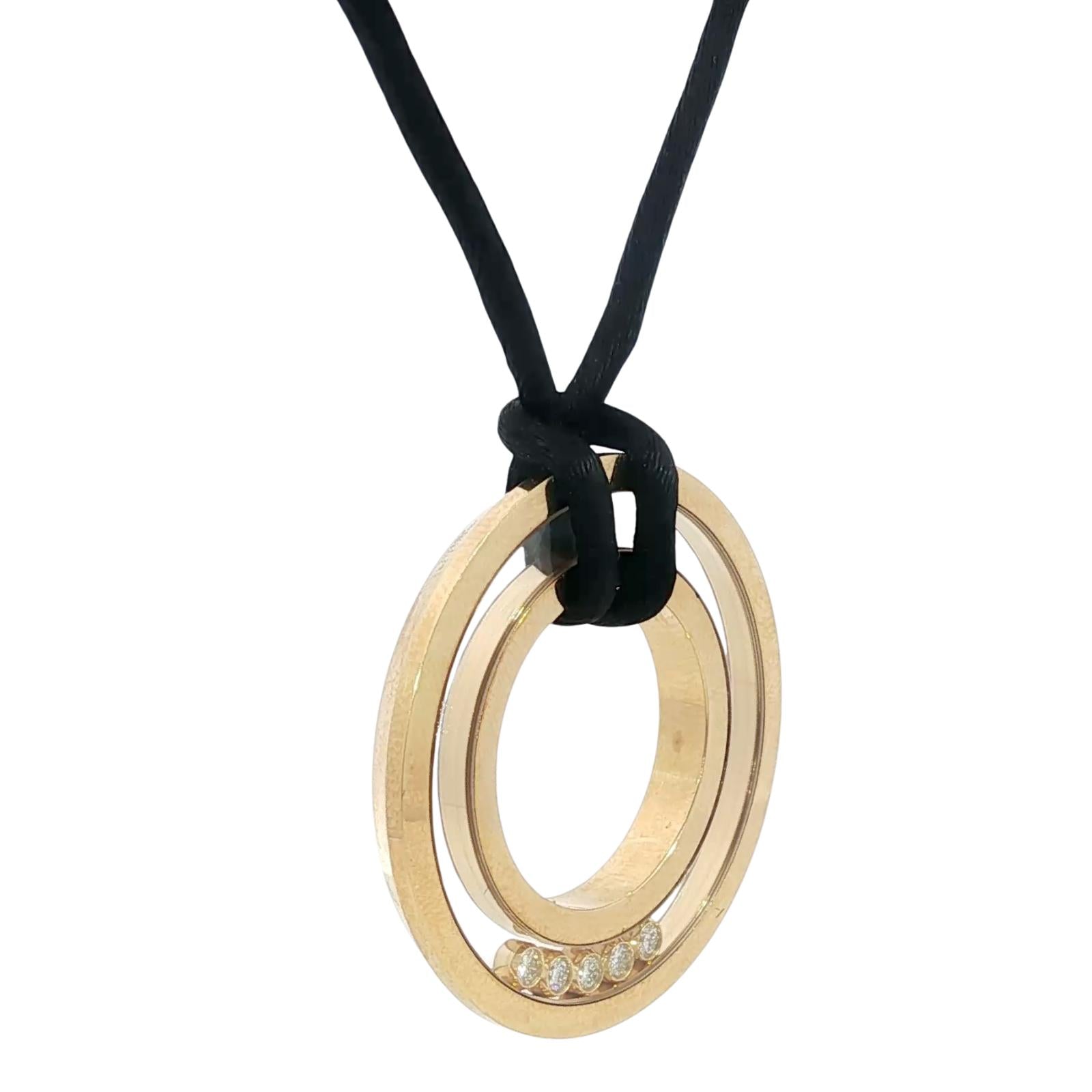 This Chopard necklace blends elegance with playful innovation. The design centers on a double-ring pendant in 18k yellow gold, featuring Chopard’s signature floating diamonds that move freely within the inner circle, catching light with every motion.
