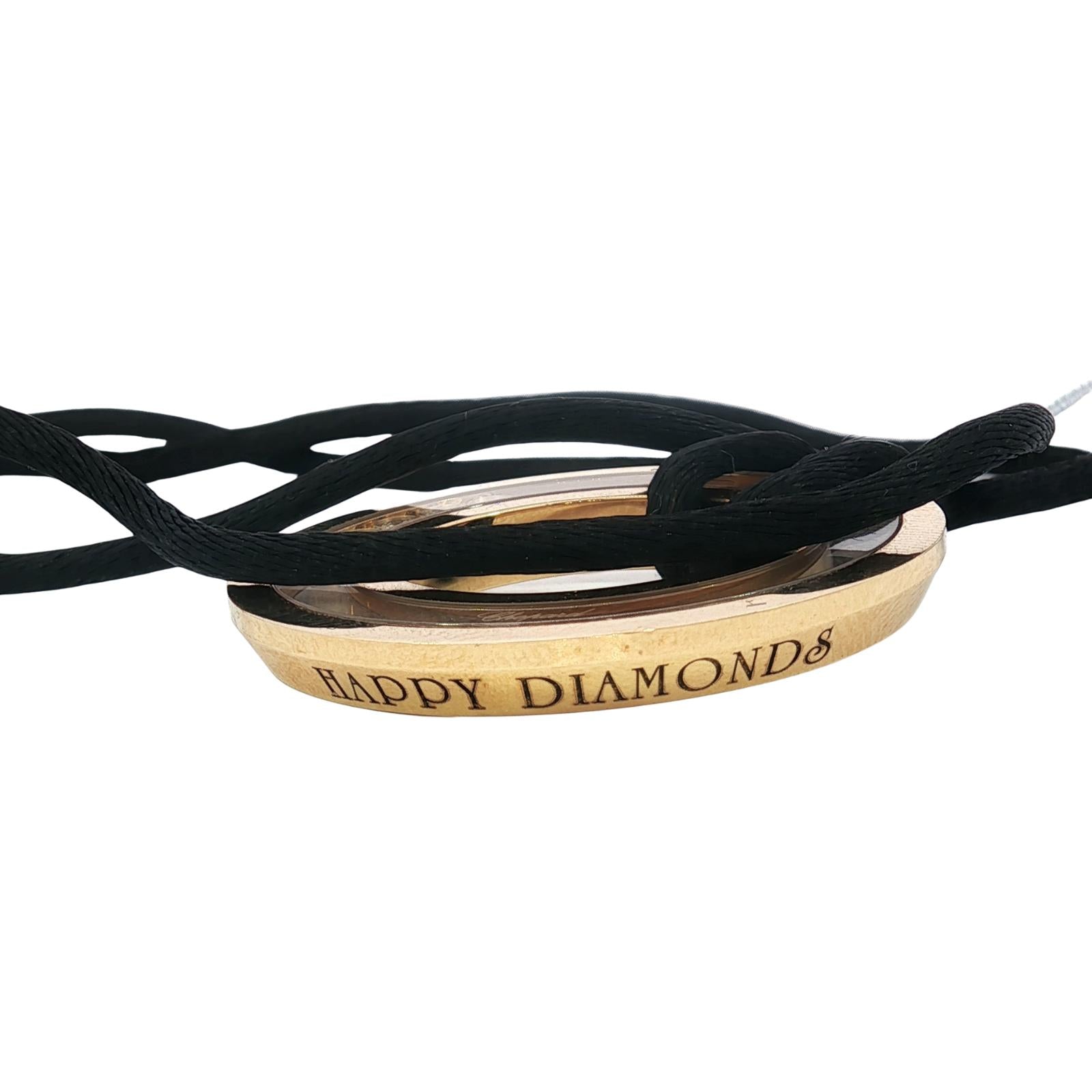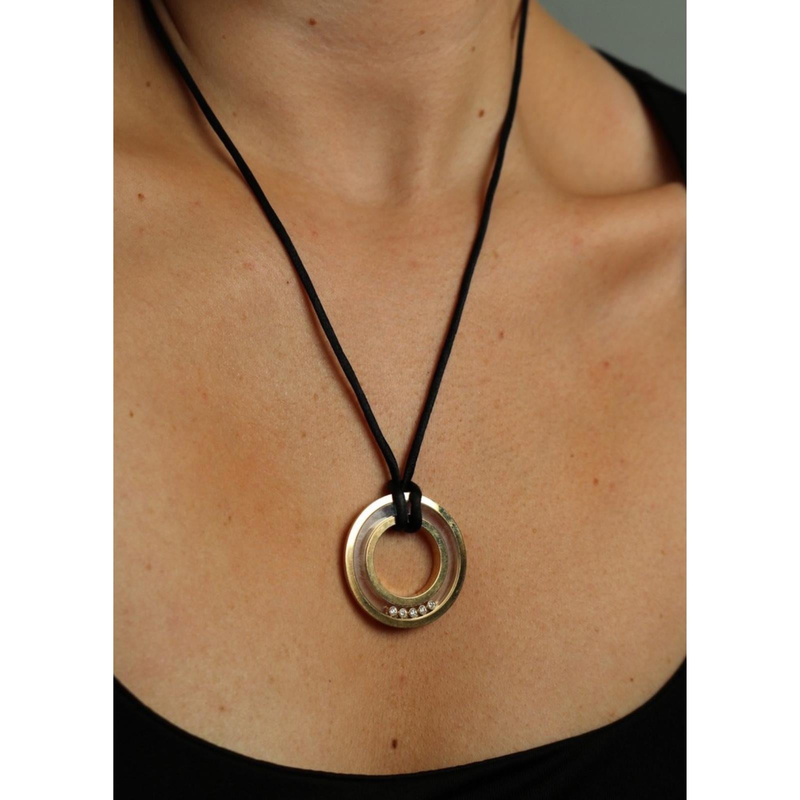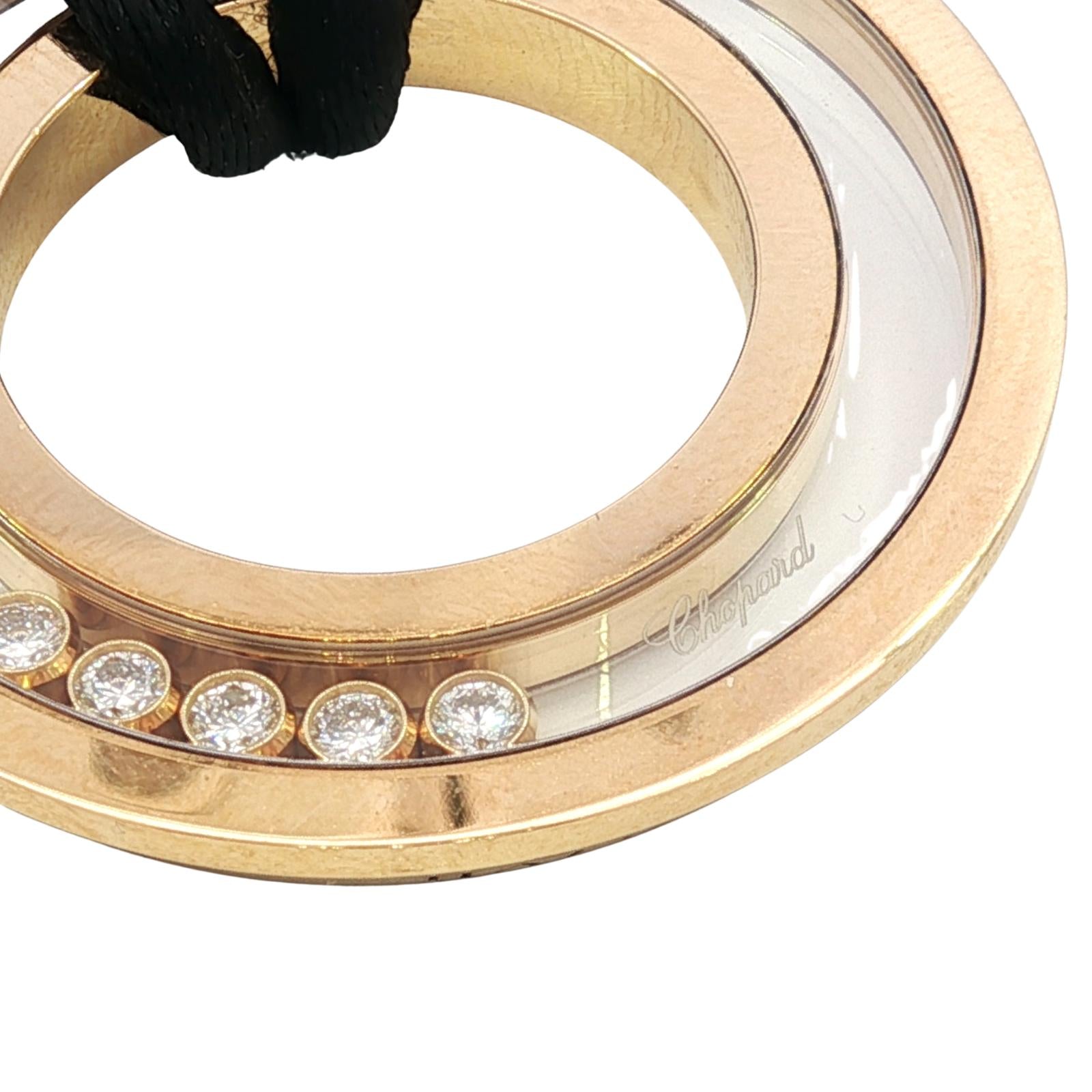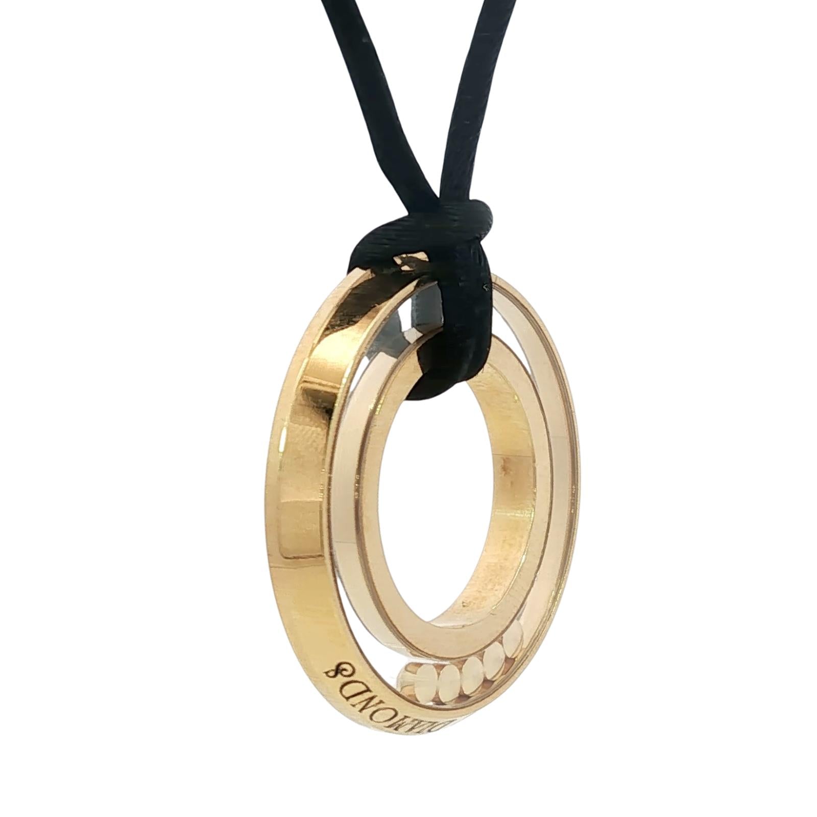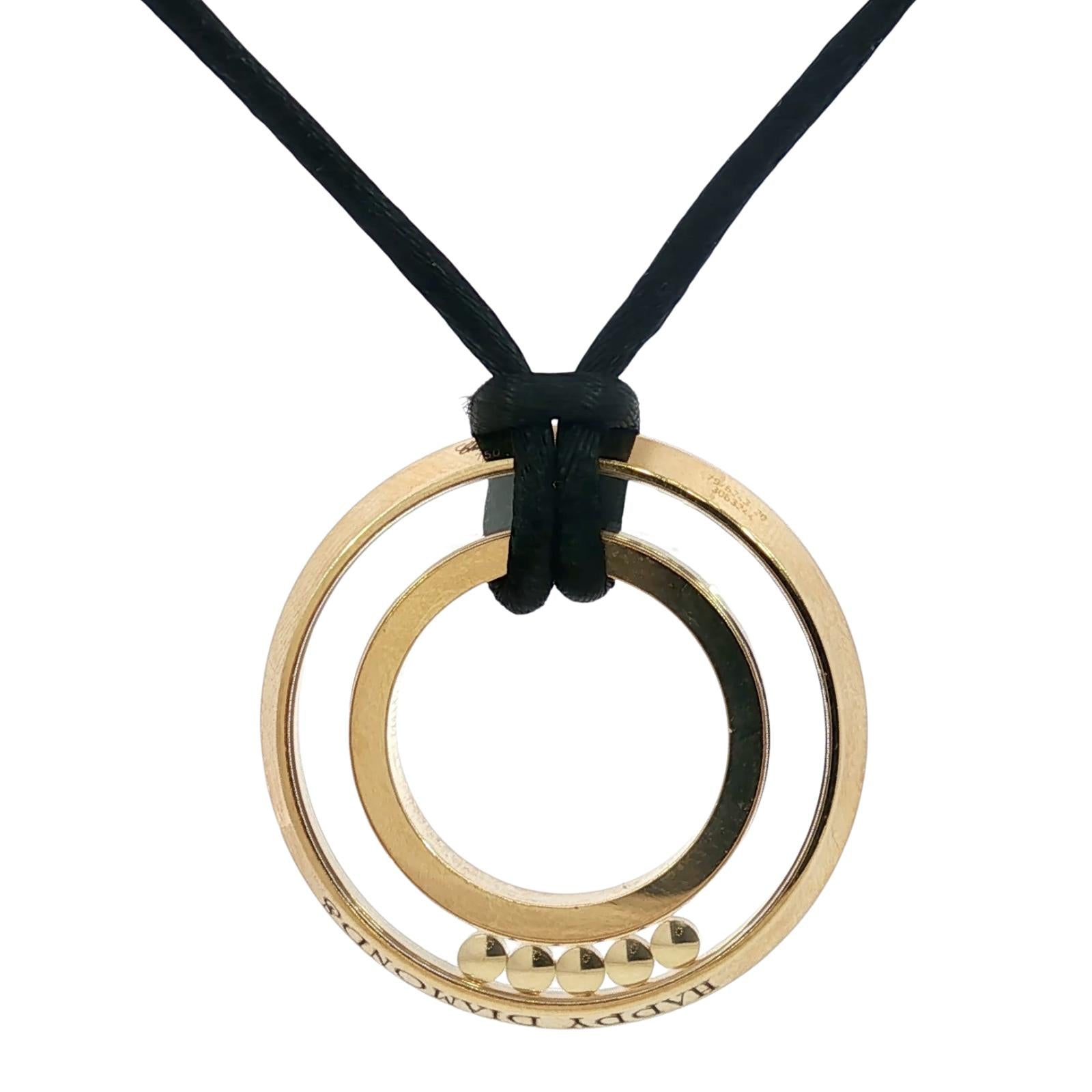 This Chopard necklace blends elegance with playful innovation. The design centers on a double-ring pendant in 18k yellow gold, featuring Chopard’s signature floating diamonds that move freely within the inner circle, catching light with every motion.