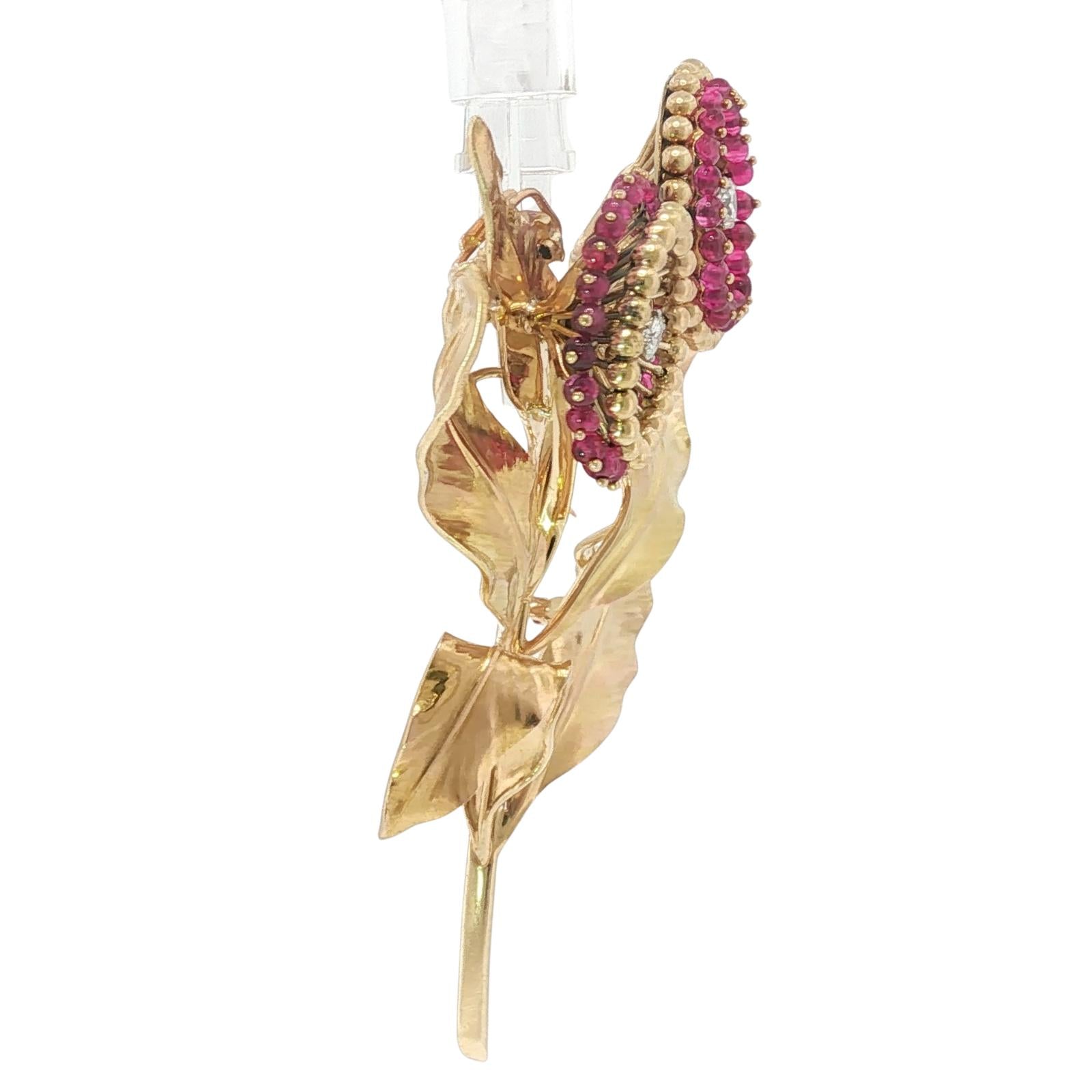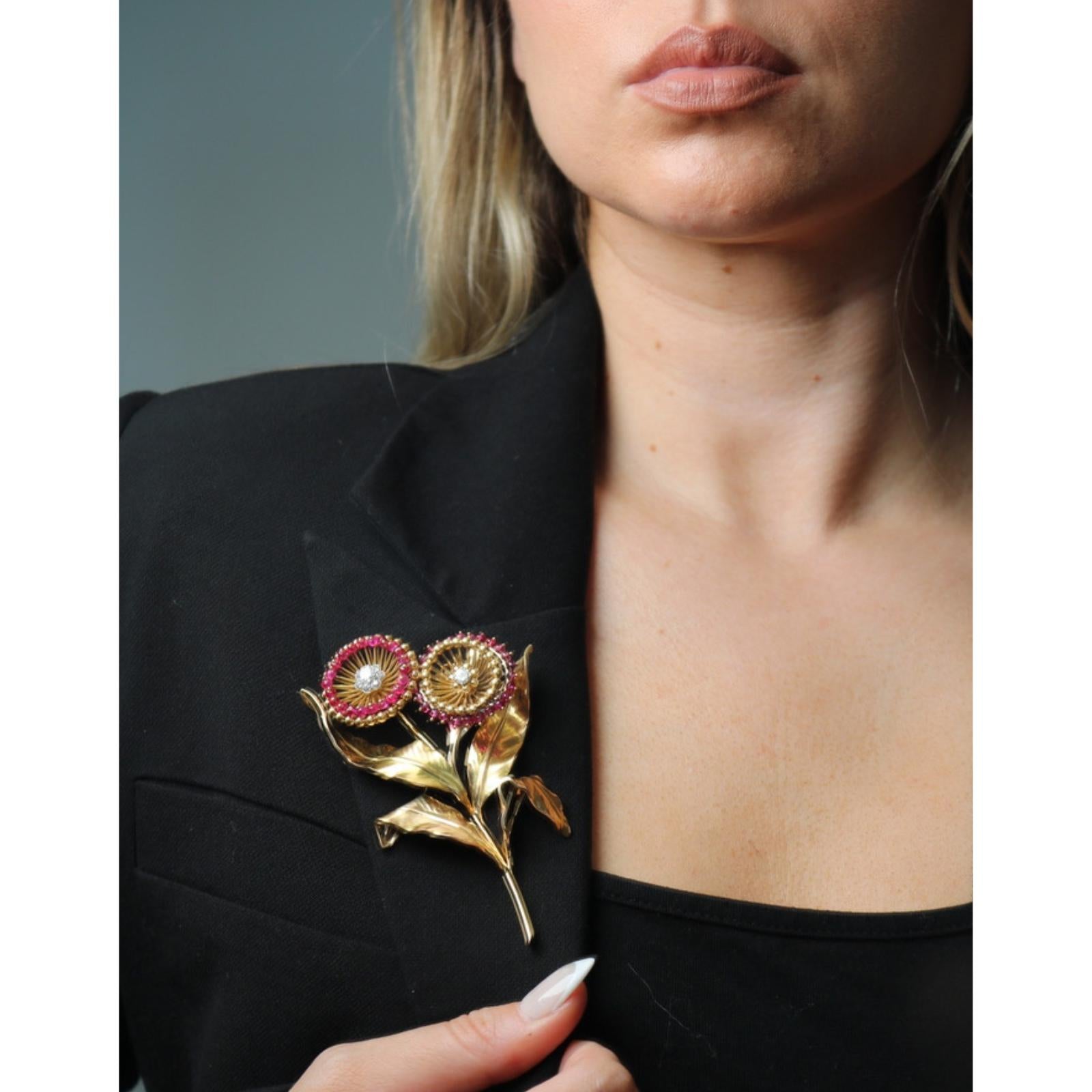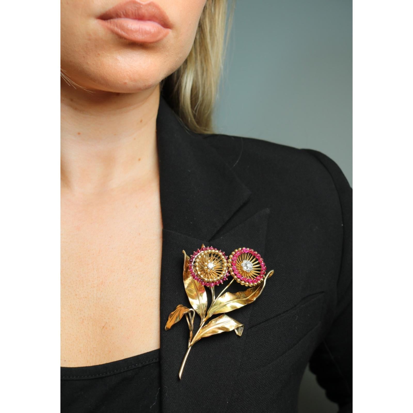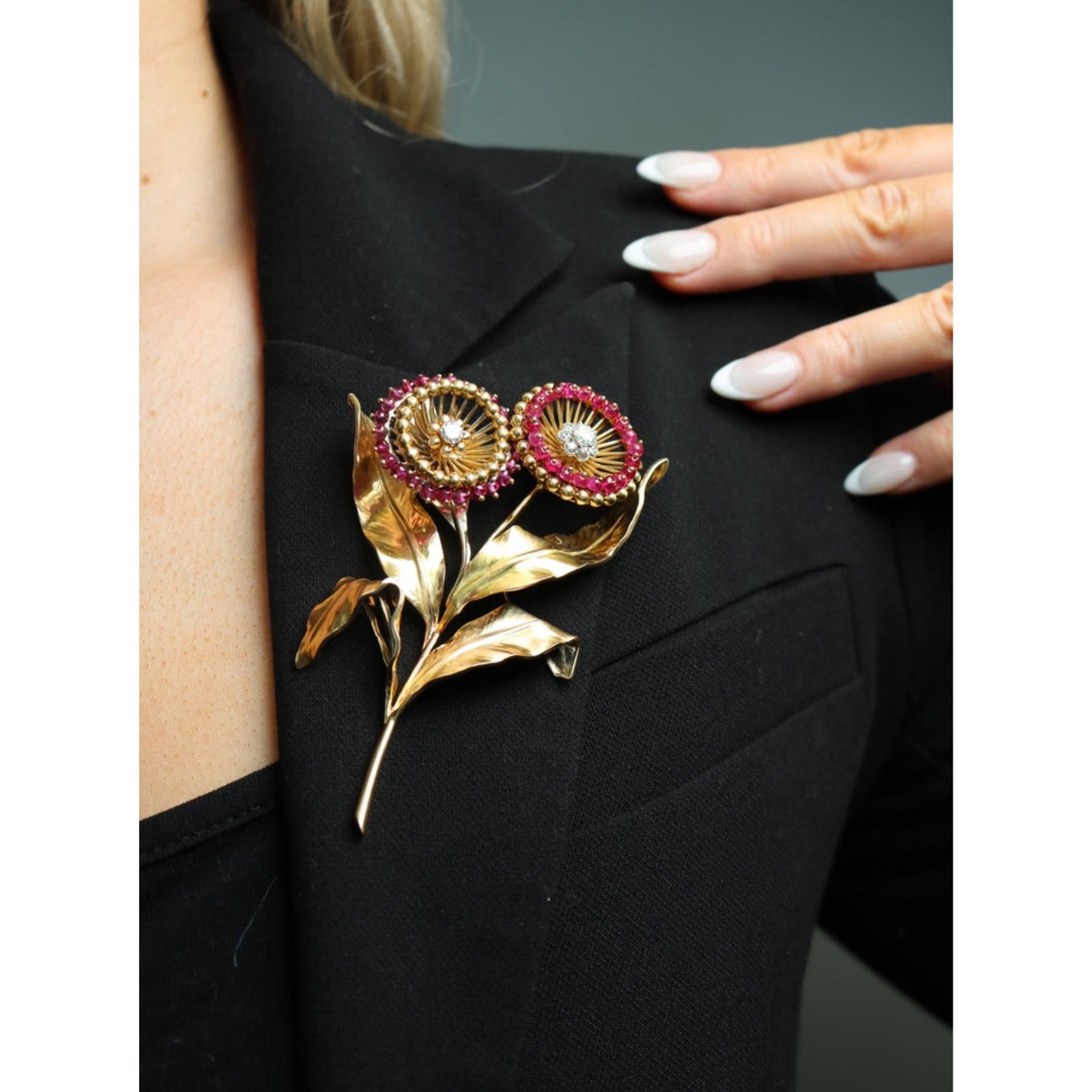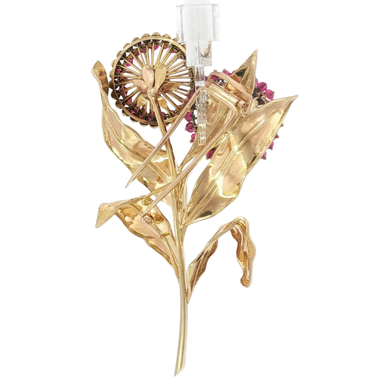 Cartier Paris Flower Brooch 18K Yellow Gold Ruby & European Cut Diamonds ~4.5ctw