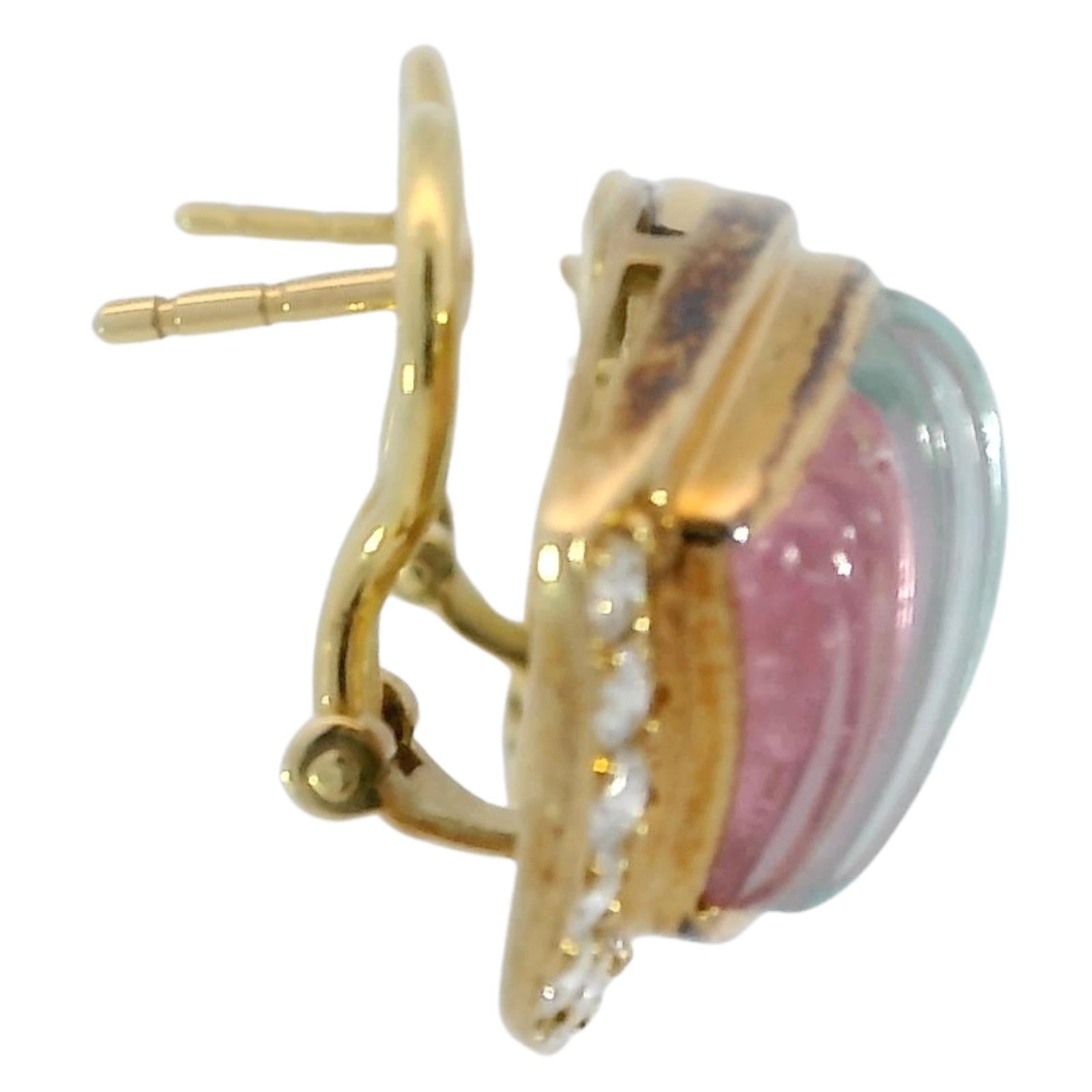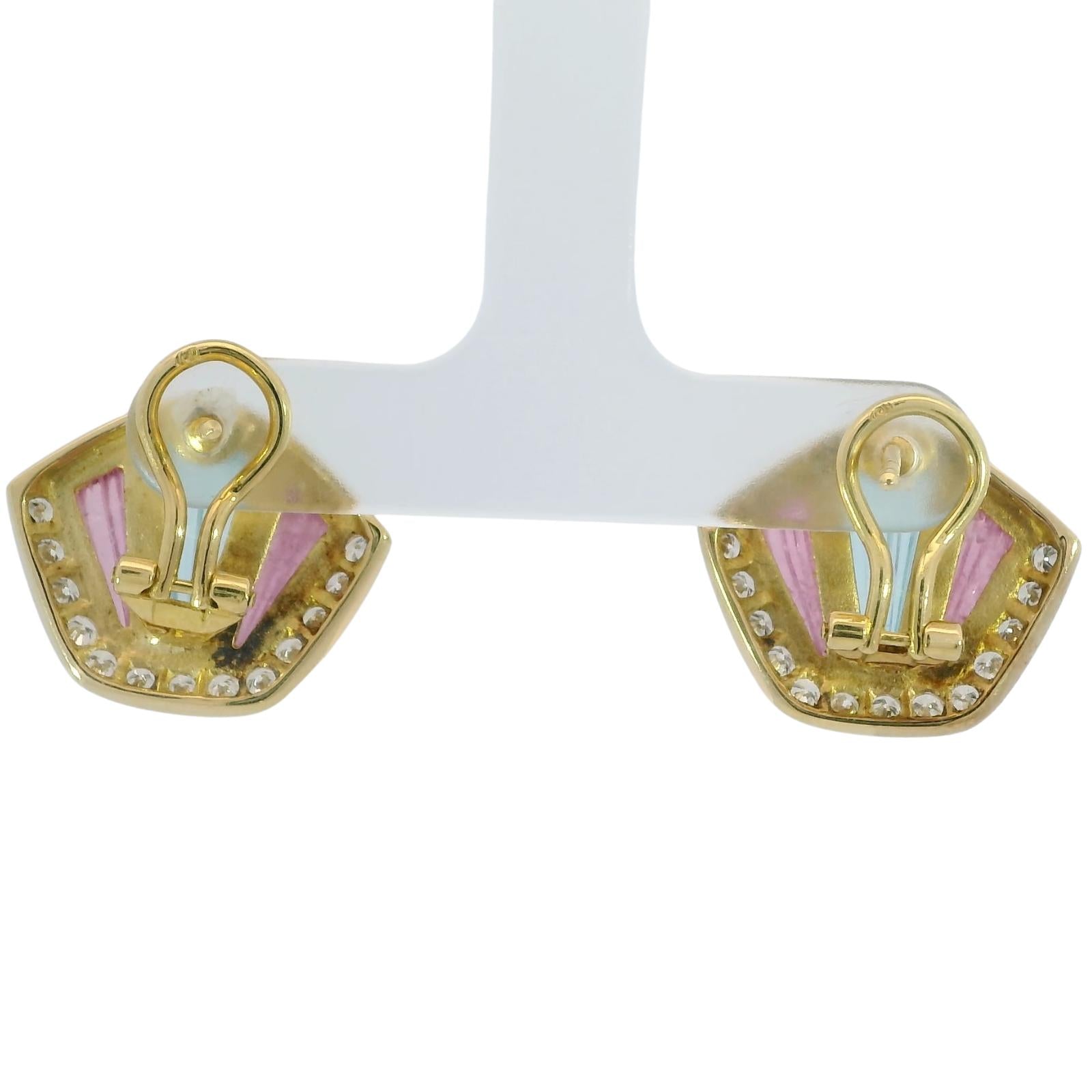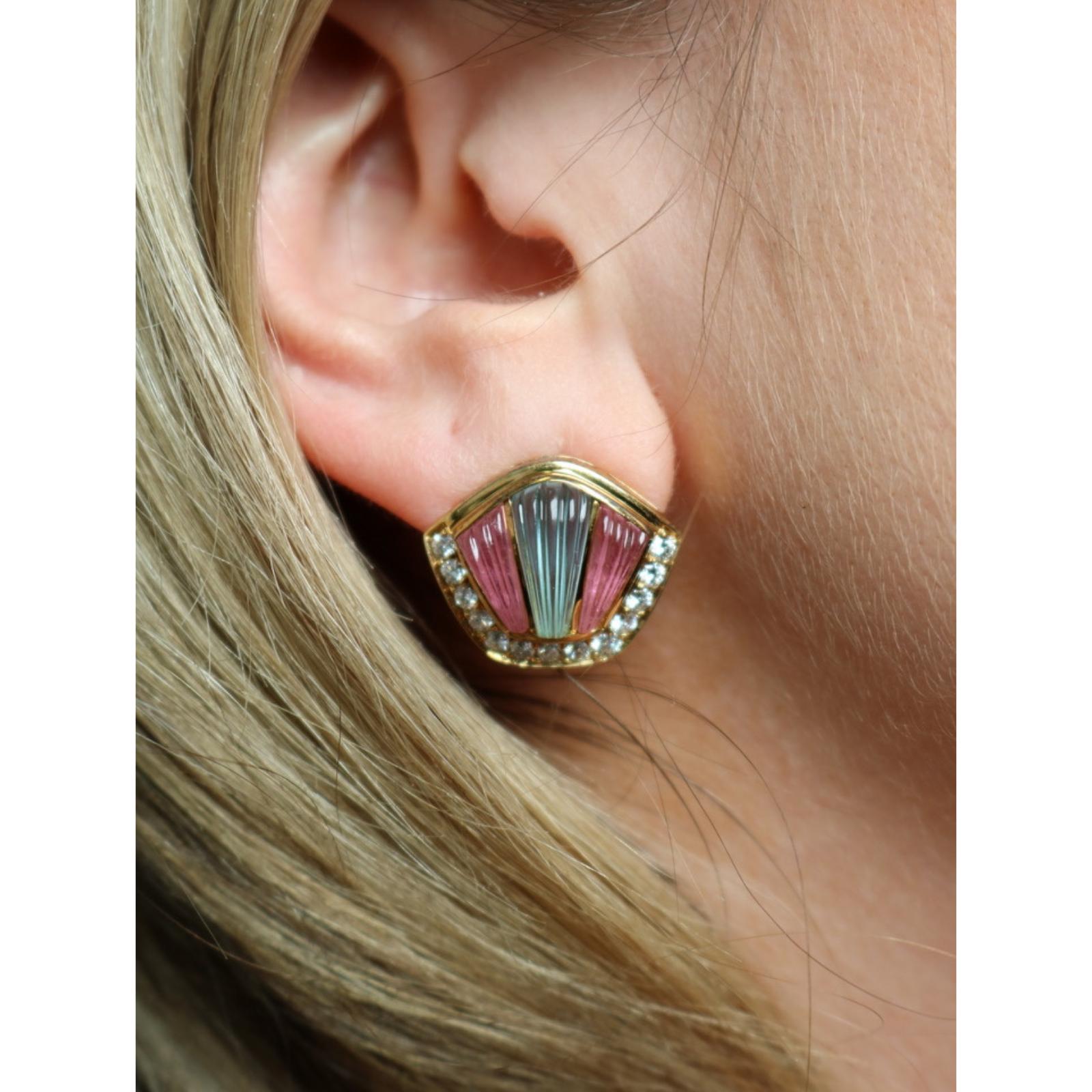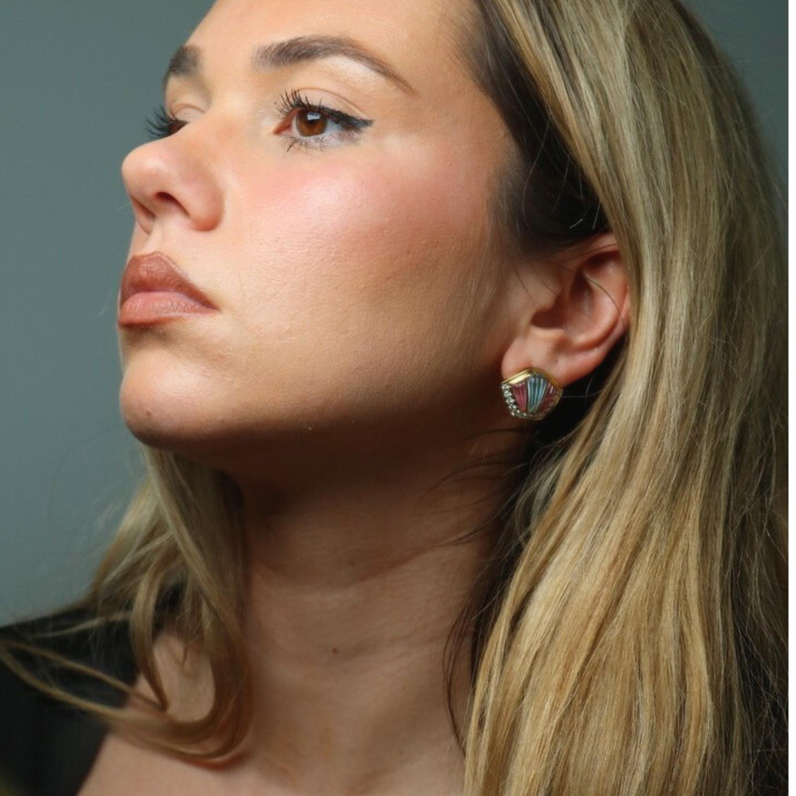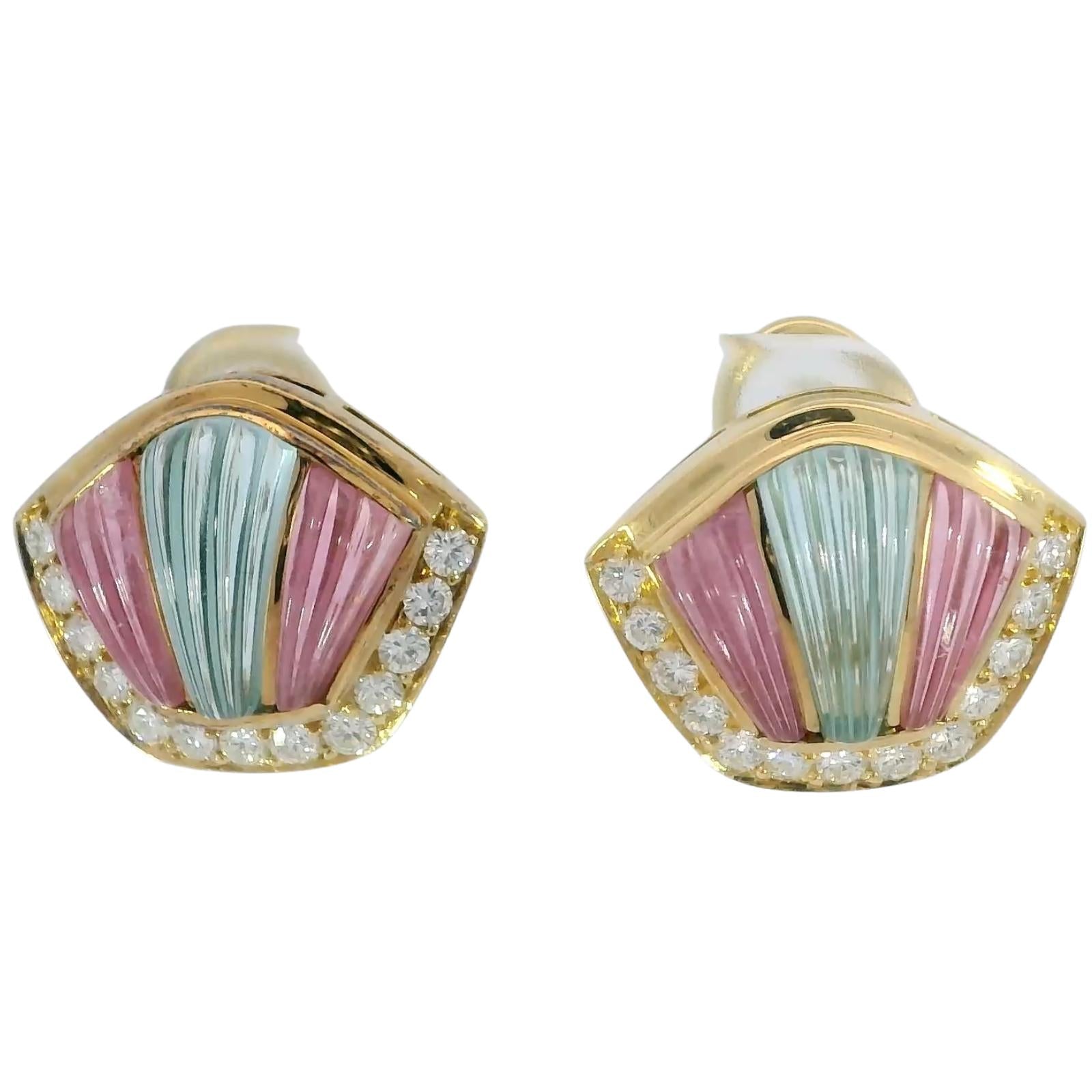 These vintage 18k yellow gold earrings from 1980 feature a fan-shaped design with ribbed sections in soft blue and pink tones. A row of round white diamonds, totaling approximately 1.04 carats, follows the curved edge, outlining the shape and adding definition to the color.