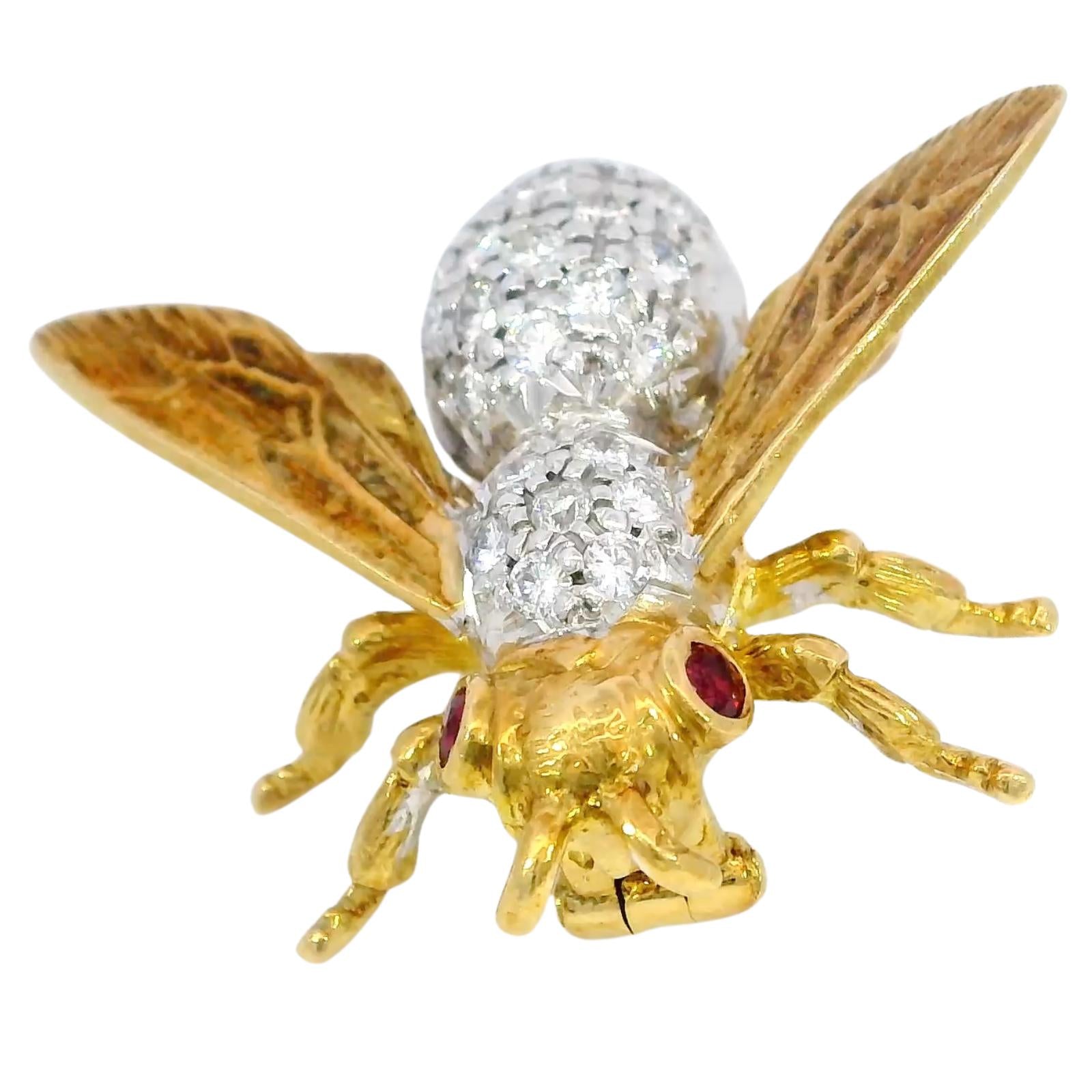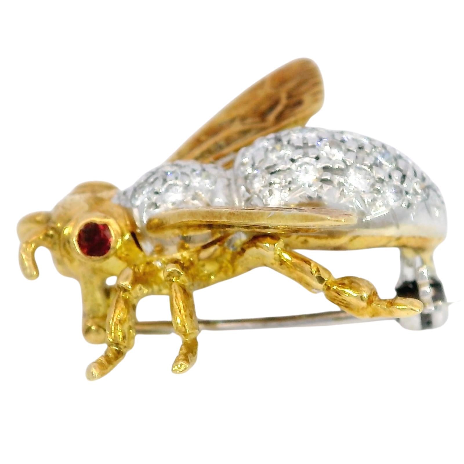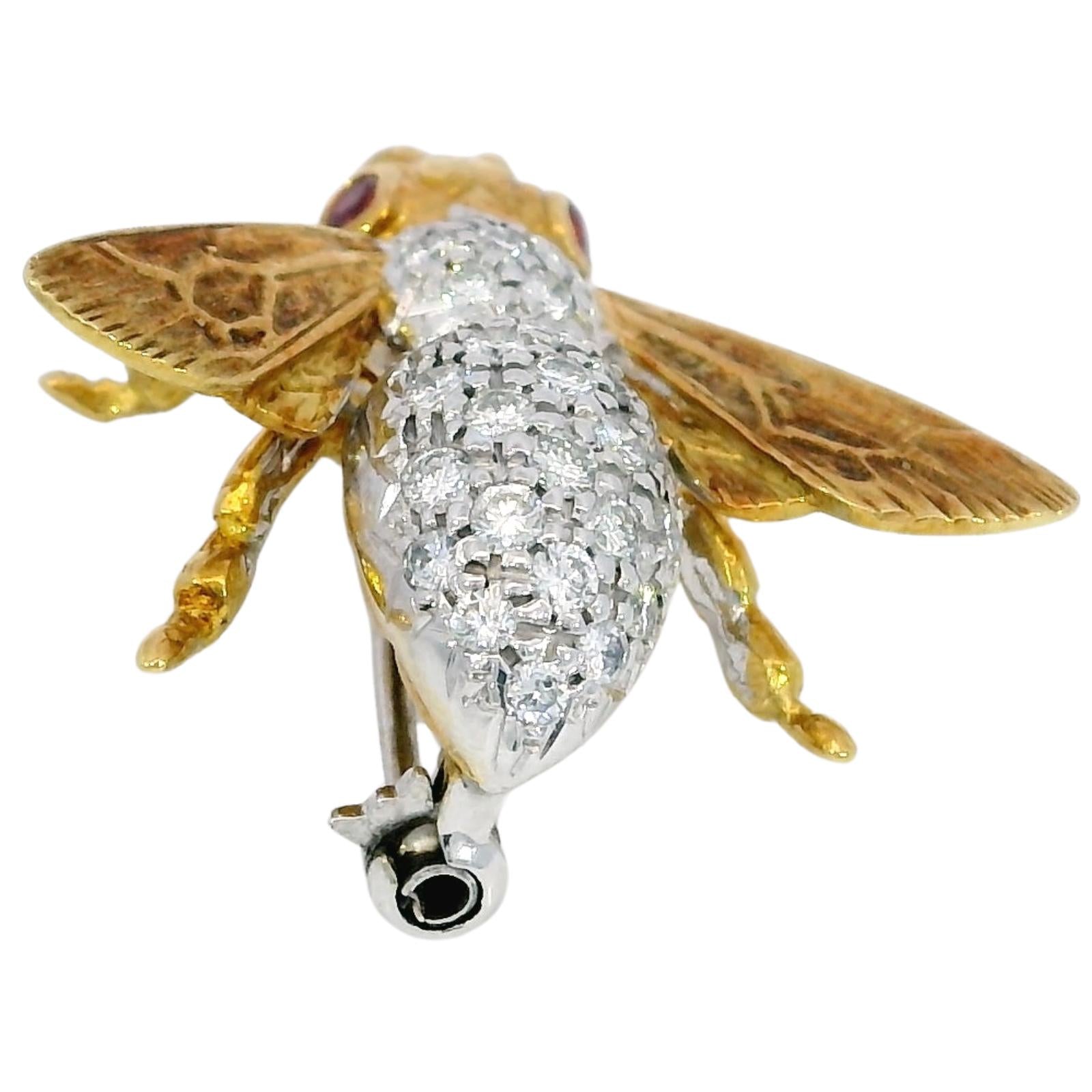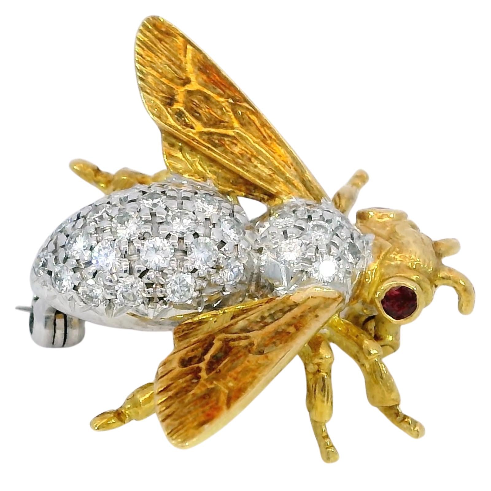 Vintage 18K Diamond Bee Brooch Yellow Gold Ruby Eyes ~0.5ctw
