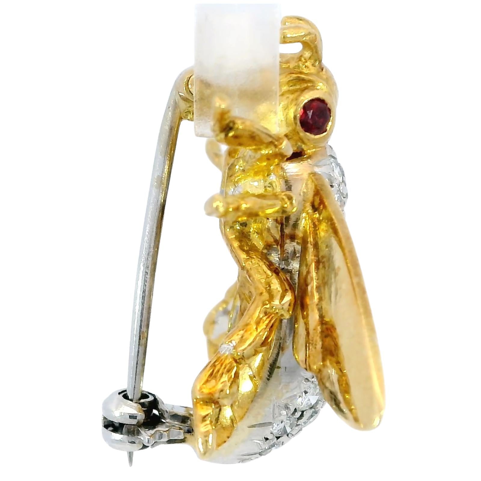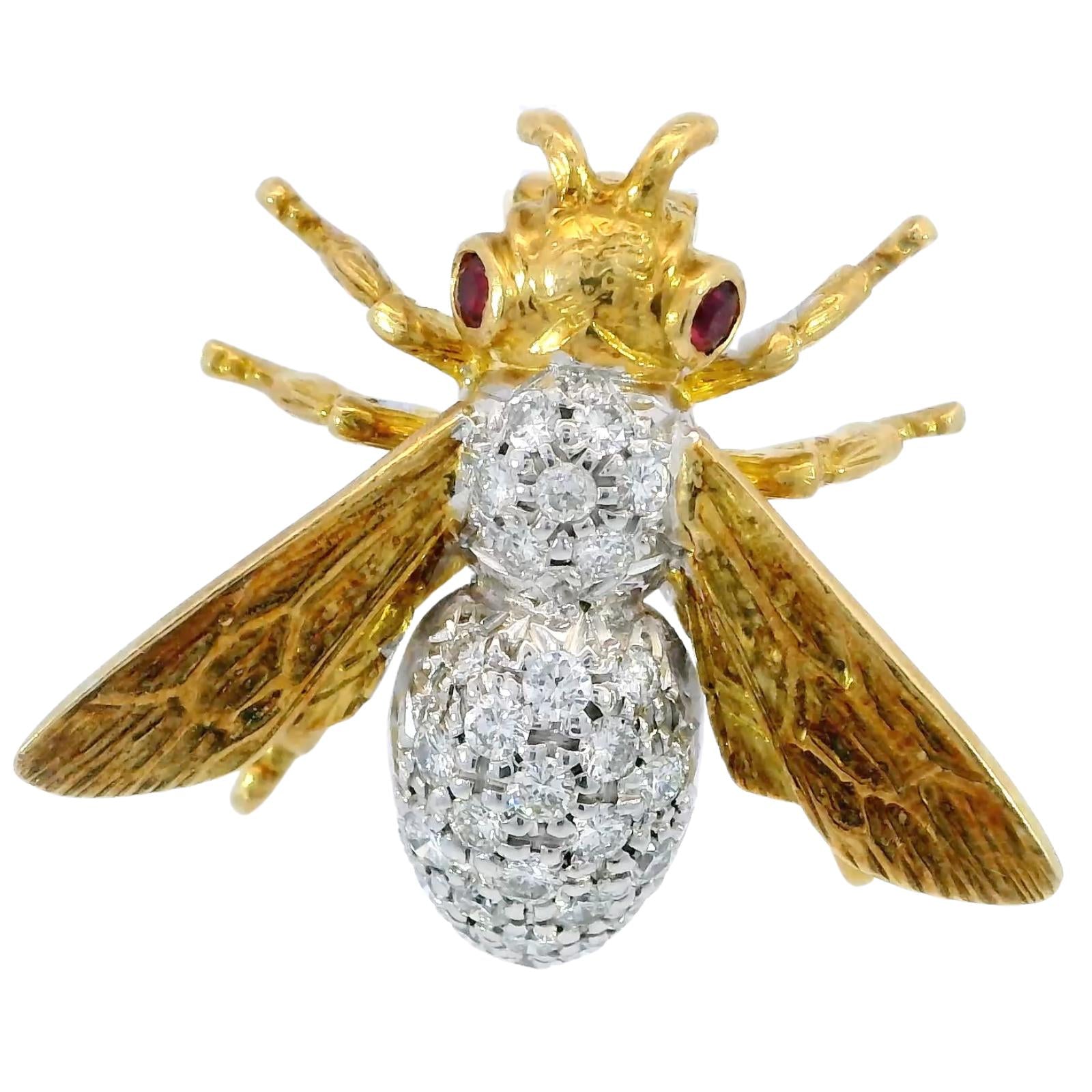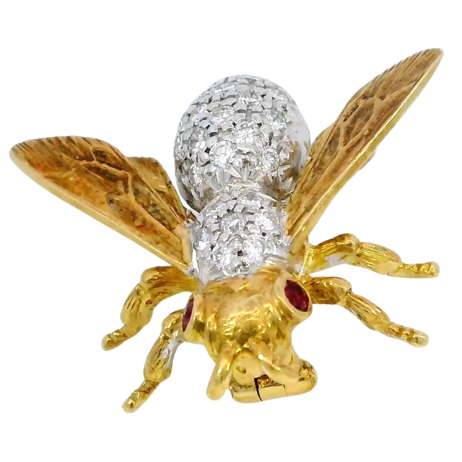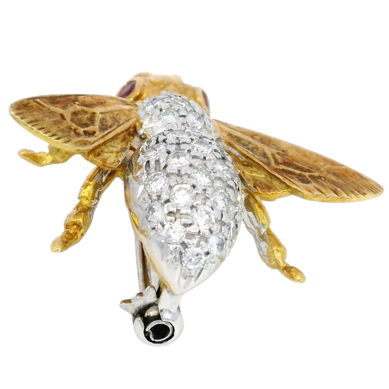 Vintage 18K Diamond Bee Brooch Yellow Gold Ruby Eyes ~0.5ctw