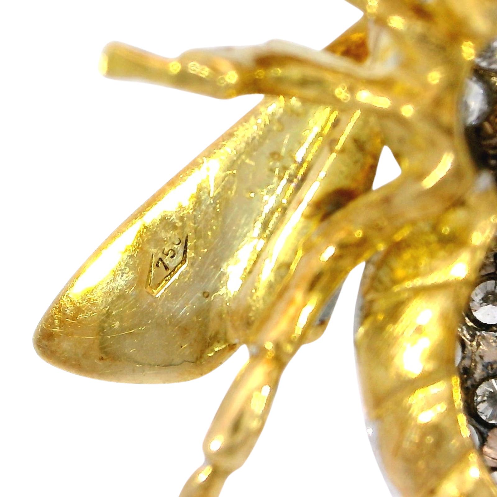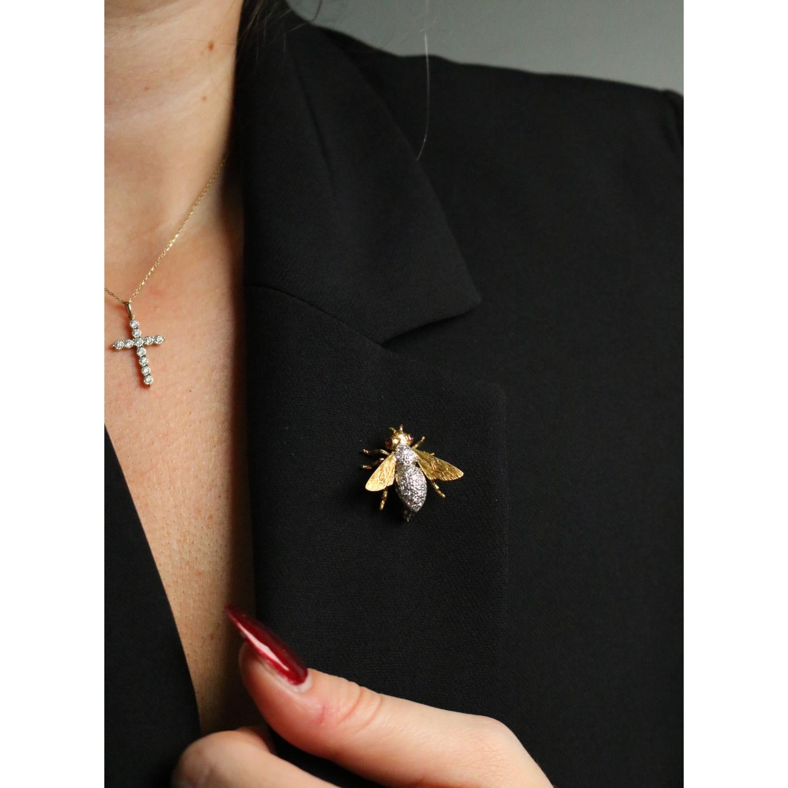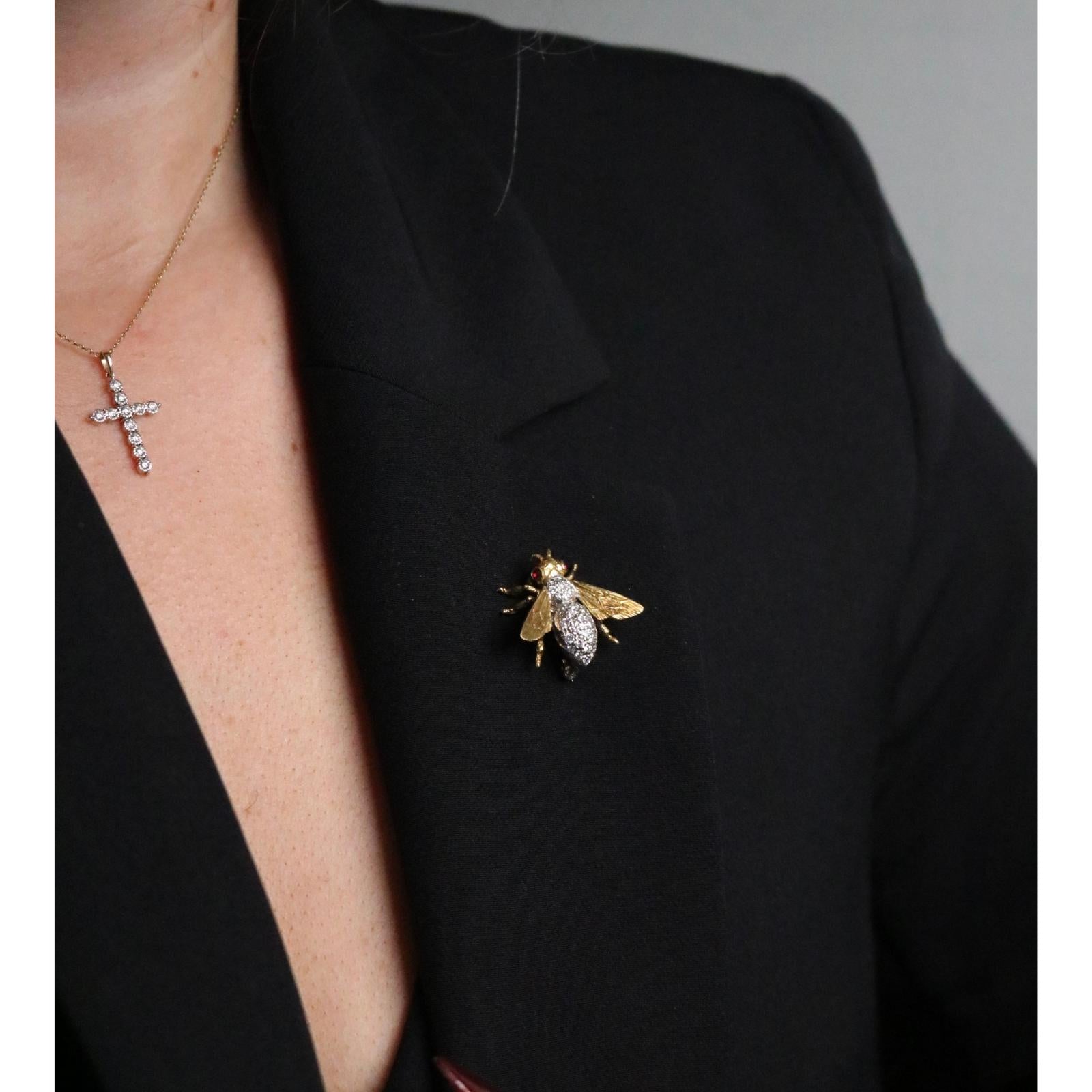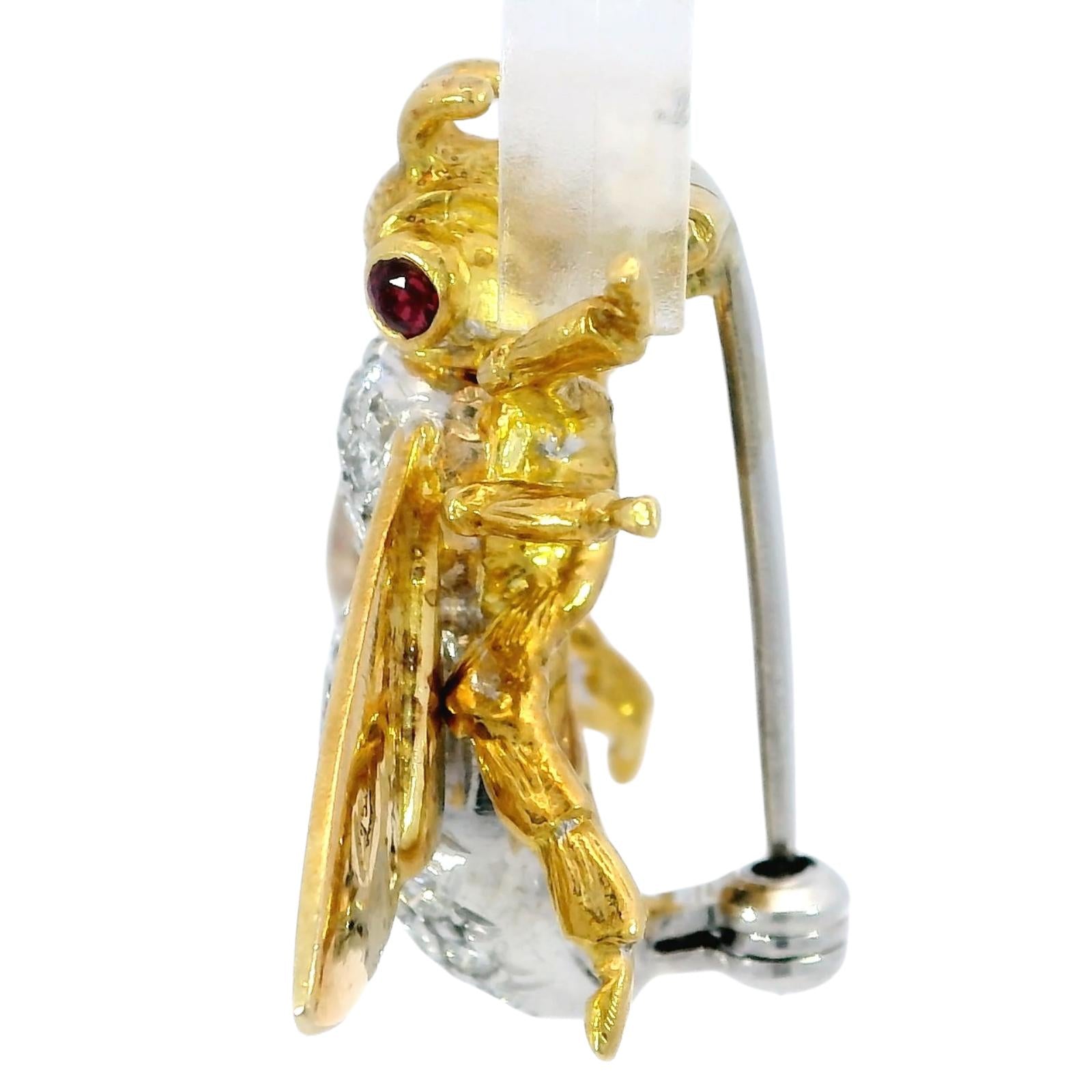 Vintage 18K Diamond Bee Brooch Yellow Gold Ruby Eyes ~0.5ctw